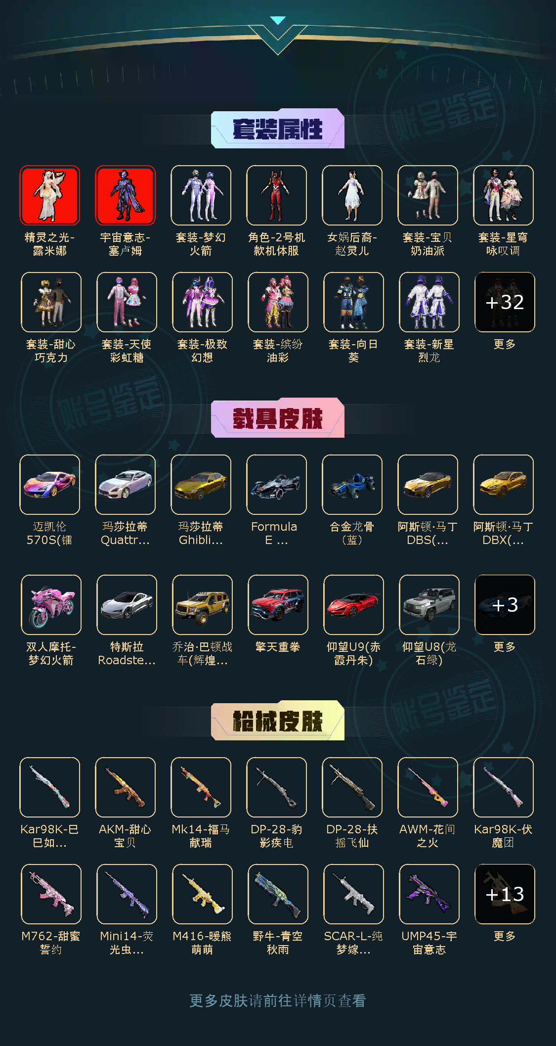 吃了 苹果V-173014热力值 10王牌印记 历史超级王牌10星 230套装 315枪皮 【17载具】 迈凯伦570S镭射紫 (5级) 玛莎拉蒂Q幻星粉 (4级) 乔治巴顿辉煌金 玛莎拉蒂金色 阿斯顿马丁S金色 阿斯顿马丁X金色 仰望U9(赤霞丹朱) 仰望U8(龙石绿) 幽澜尊爵(静谧蓝) 特斯拉R尊享铂 Formula(幽光蓝) 合金龙骨蓝色 擎天重拳 双人摩托梦幻火箭 塞莎深潜蓝 (1级) 鬼马风驰 萌兔起飞僚机 【2神装】 精灵之光-露米娜 宇宙意志-塞卢姆 【2稀有】 奇异狩猎者 AKM-百万伏特 【41粉装】 红螳螂 梦幻火箭 猪猪侠 赵灵儿 宝贝奶油派 天使彩虹糖 甜心巧克力 洛天依 金风玉露 幻影战神 金属狂野 缤纷油彩 放客神游 快乐主宰 数码大师 古堡领主 彗云及圣 狩月元帅 琉璃脉冲 新星烈龙 向日葵 甜蜜誓约 心之恋语 极致幻想 扶摇飞仙 幻彩马卡龙 潮汐统领 灵感创作师 黄蜂伯爵 千面幻镜 鳞翅贤者 星点战士 草莓生巧 诡面斩 香水柠檬 冰霜白皇 炙焰红王 暖熊萌萌 音爆索尼克 海螺星光 蓝莓炮弹 【24特效枪】 SCAR-L-梦幻火箭 (3级) M416-五爪金龙 (1级) SCAR-L-纯梦嫁纱 (1级) M416-心之恋语 (1级) AKM-甜心宝贝 (3级) AKM-炫紫旋律 (1级) UMP45-宇宙意志 (3级) Kar98K-巳巳如意 (5级) Kar98K-伏魔团 (5级) M762-甜蜜誓约 (6级) DP-28-扶摇飞仙 (6级) AWM-花间之火 (5级) Mini14-荧光虫舞 (5级) GROZA-精灵之光 (3级) GROZA-香水柠檬 (3级) AKM-星际浪客 (2级) M762-激战未来 (3级) M416-暖熊萌萌 (1级) 汤姆逊-怪笑疯兔 (3级) 野牛-青空秋雨 (3级) UMP45-启明星 (3级) MK20-H-海螺星光 (2级) M249-蓝莓炮弹 (2级) SKS-碧影闪光 (3级) 【17飞行器】 精灵迷巫飞行器 马卡龙飞行器 伏魔团飞行器 扶摇飞仙飞行器 繁花小夜曲飞行翼 心之恋语飞行翼 至尊龙雀飞行服 梦幻火箭飞行器 荧光虫舞飞行器 童趣迷兔飞行器 四圣焕新飞行器 甜蜜誓约飞行器 古堡领主飞行器 深渊漩涡飞行器 纯梦嫁纱飞行翼 歌者泠鸢飞行器 千面幻镜飞行器 【37热门】 雪山精英 星兔领航员 蔷薇魔法师 暗夜行者 大橘为重 浪漫波比 暗夜契约 怪笑疯兔 诡面顽熊 赛罗奥特曼 团圆交子 瑞龙福将 纯白誓言 忍者信条 酷熊伴侣 冰爽海盐 影双刃 薄荷蓝莓 白虎圣者 朱雀圣者 玄武圣者 青龙圣者 蓝甜马卡龙 粉甜马卡龙 海洋之心 安第斯皇冠 机械英豪 新侠客行 黑色刀锋 军刀雅典娜 M416-快乐主宰 M762-瑞龙福将 M249-古堡领主 Kar98K-古堡领主 Kar98K-PEC最牛战神 M24-香水柠檬 AWM-激战未来 【12头盔】 精灵迷巫头盔 梦幻火箭头盔 火曜朱雀头盔 甜心宝贝头盔 百万伏特头盔 金风玉露头盔 金属狂野头盔 甜蜜誓约头盔 心之恋语头盔 马卡龙头盔 花间之火头盔 夏日绵绵冰头盔 【14背包】 精灵迷巫背包 梦幻火箭背包 火曜朱雀背包 甜心宝贝背包 百万伏特背包 金风玉露背包 金属狂野背包 萌熊伴侣背包 神秘黑猫背包 古堡领主背包 甜蜜誓约背包 心之恋语背包 马卡龙背包 花间之火背包
