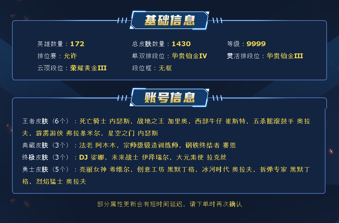 ~~喜欢记得收藏~~可排位~~1395皮全英雄~~租之前尽量查一下游戏ID,确保段位是您需要的,避免浪费您的时间~~请勿挂机逃跑故意送人头,谢谢合作,谢谢~~