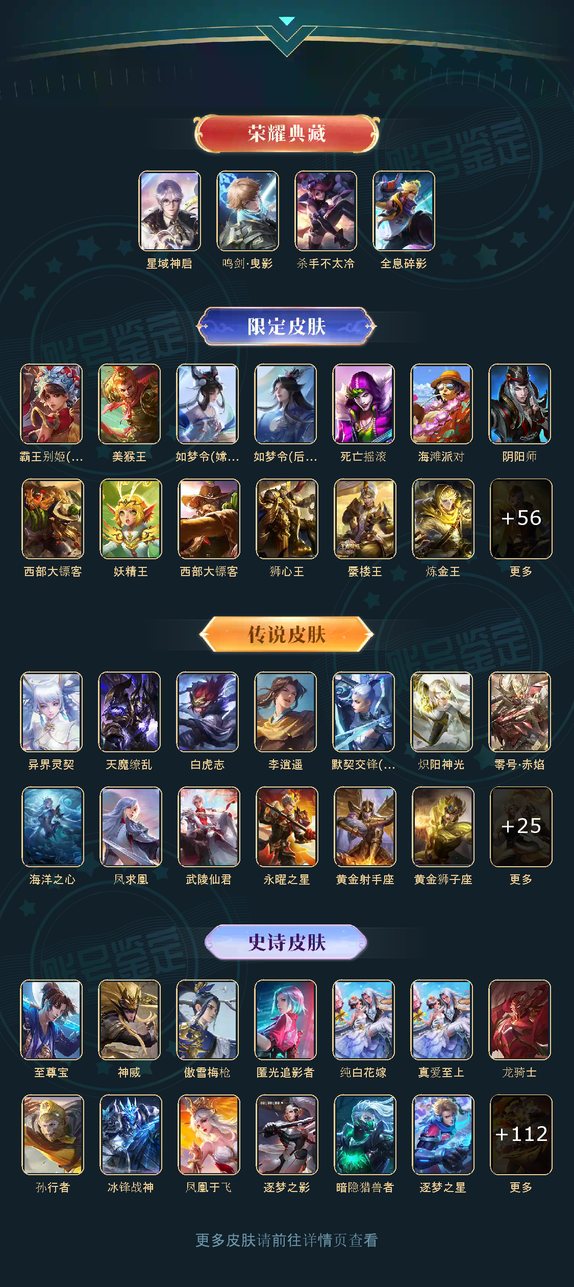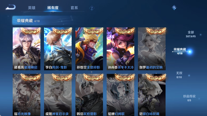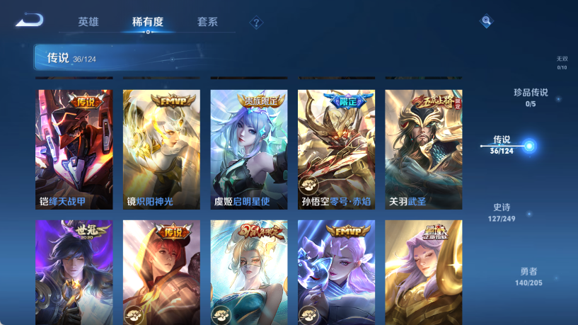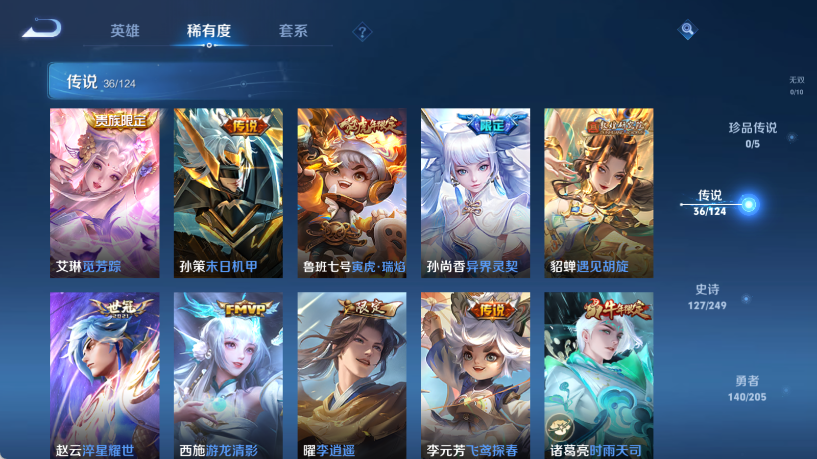 贵族等级V10,英雄数量125,典藏皮肤数4,皮肤数量405,冰锋战神街头霸王纯白花嫁天魔缭乱至尊宝杀手不太冷真爱至上王者之锤凤求凰逐梦之影武陵仙君黄金狮子座一生所爱全息碎影大圣娶亲冰霜恋舞曲青龙志白虎志朱雀志太华飞衡梁祝白鹤梁神女匿光追影者鸣剑·曳影遇见胡旋龙胆星域神启李逍遥武圣孙行者玉兔公主异界灵契神威傲雪梅枪淬星耀世时雨天司