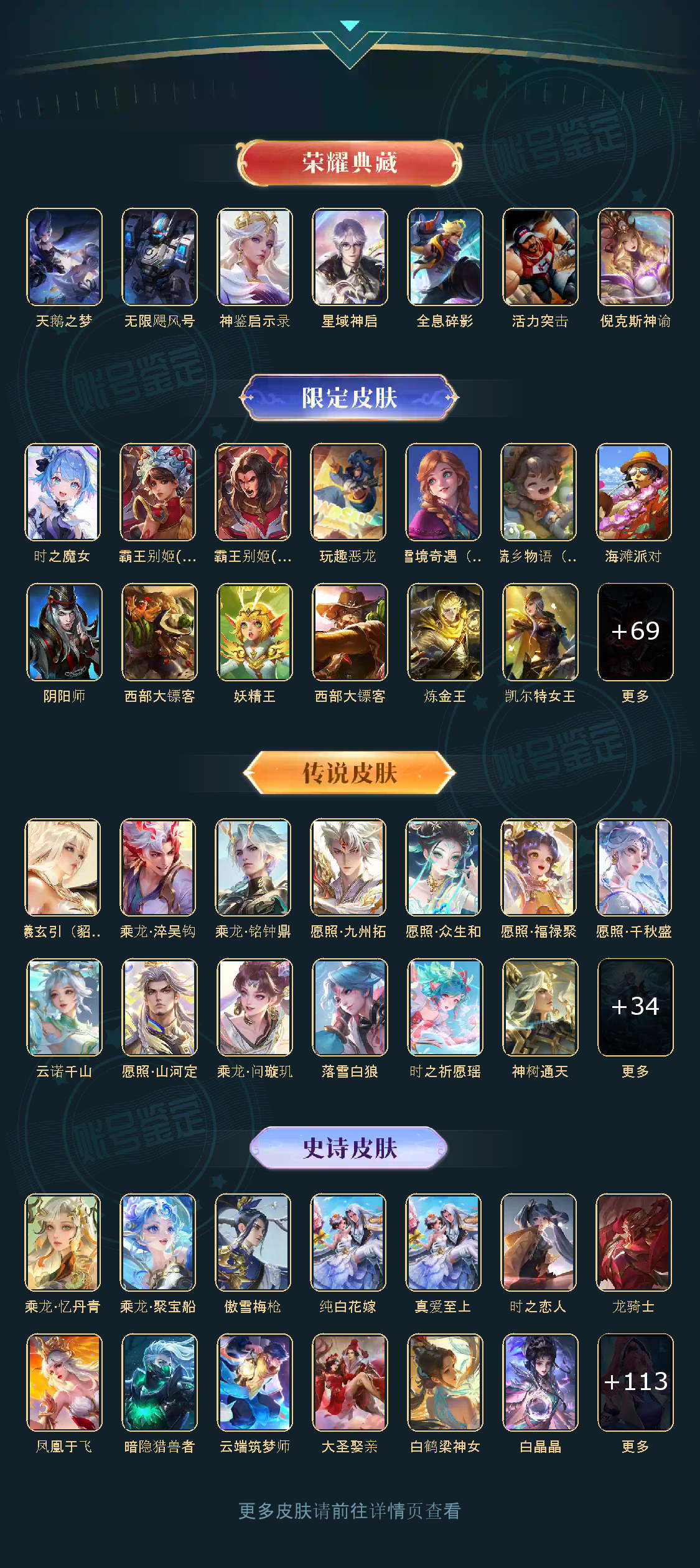 天鹅之梦,无限飓风号,神鉴启示录,星域神启,时之魔女,乘龙·问璇玑,乘龙·淬吴钩,乘龙·铭钟鼎,乘龙·聚宝船,乘龙·忆丹青,纯白花嫁,真爱至上,愿照·九州拓,愿照·众生和,落雪白狼,愿照·福禄聚,时之祈愿瑶,曦玄引(貂蝉),愿照·千秋盛,神树通天,云诺千山,愿照·山河定,傲雪梅枪