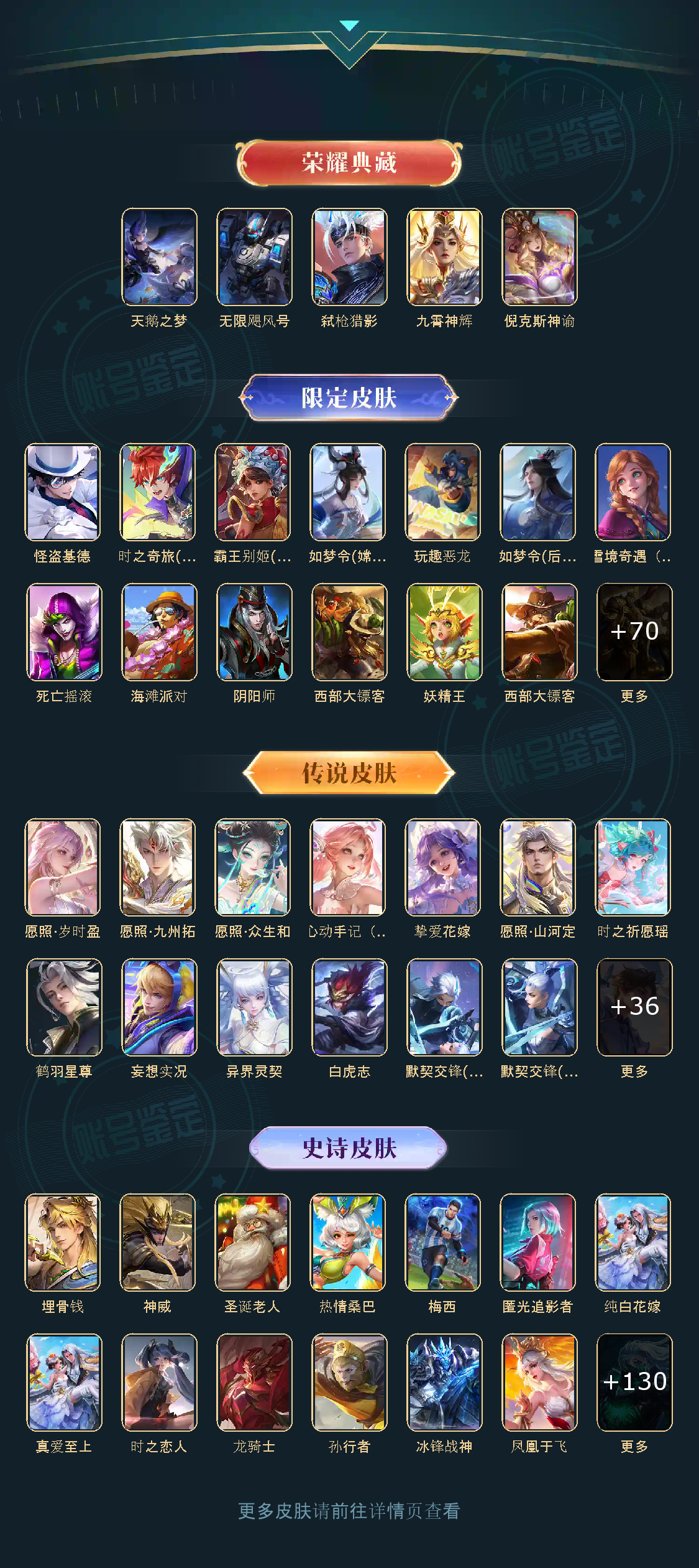 贵族等级V10,英雄数量125,典藏皮肤数5,皮肤数量448,天鹅之梦/无限飓风号/倪克斯神谕/补天