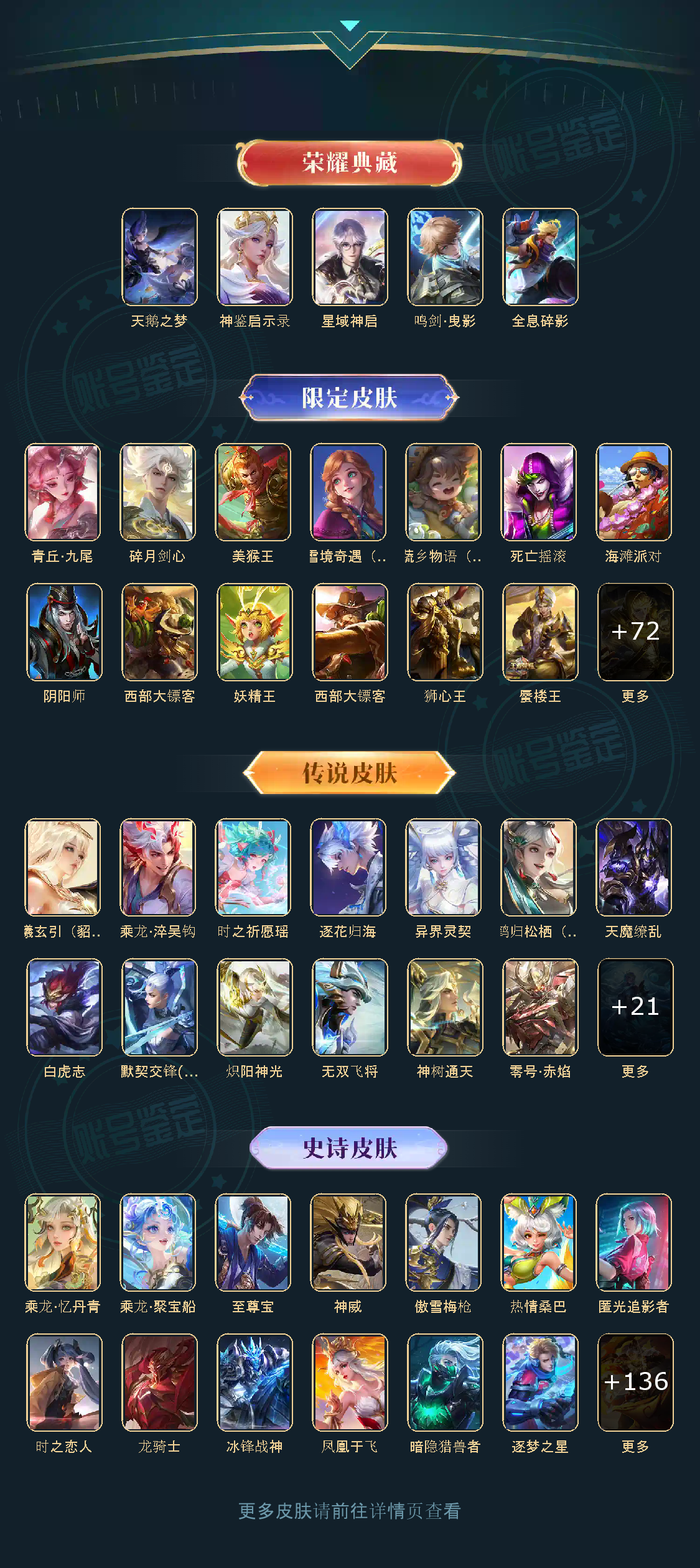 贵族等级V10,英雄数量124,典藏皮肤数6,皮肤数量432,天鹅之梦/全息碎影/鸣剑·曳影/星域神启