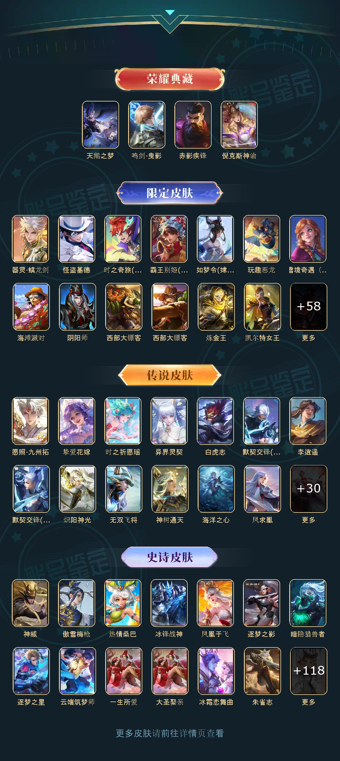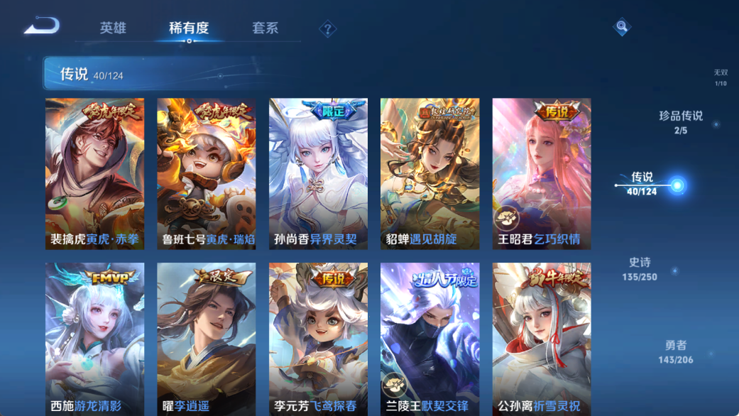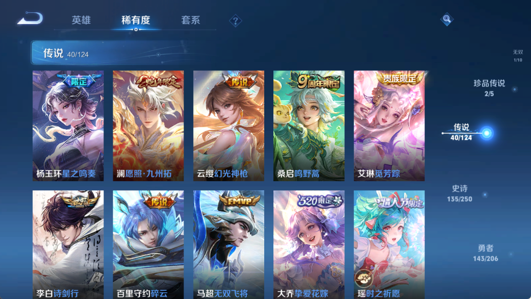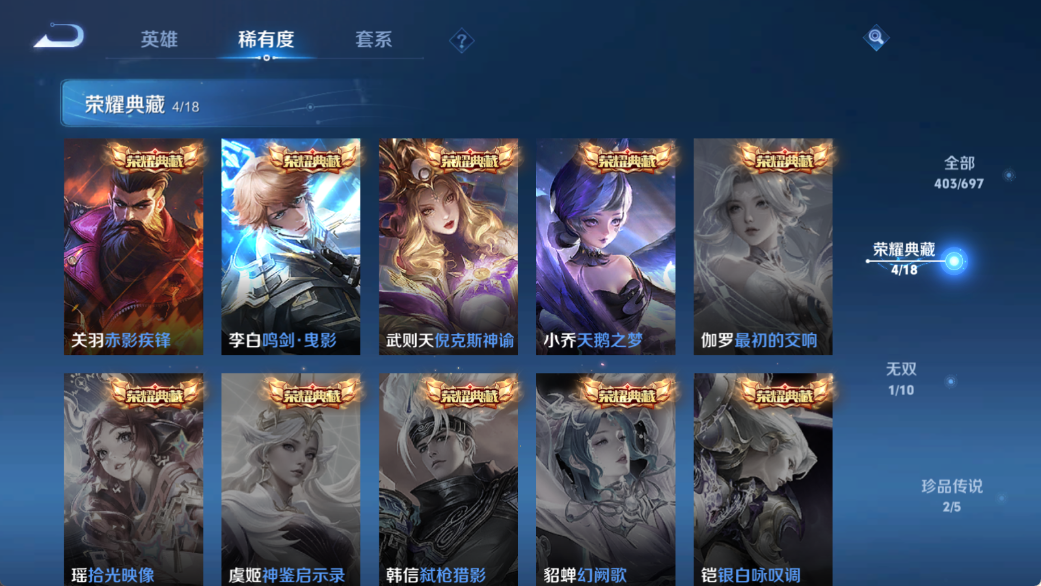 贵族等级V10,英雄数量124,典藏皮肤数4,皮肤数量403,天鹅之梦/倪克斯神谕/鸣剑·曳影/李逍遥
