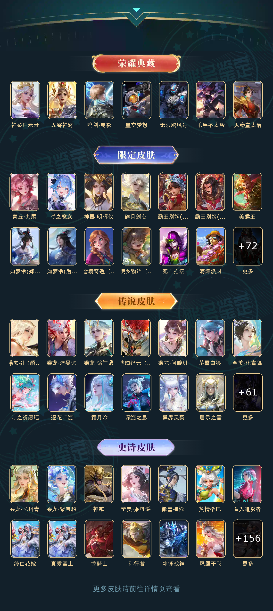 贵族等级V10,英雄数量125,典藏皮肤数7,皮肤数量506,大秦宣太后/星空梦想/无限飓风号/鸣剑·曳影
