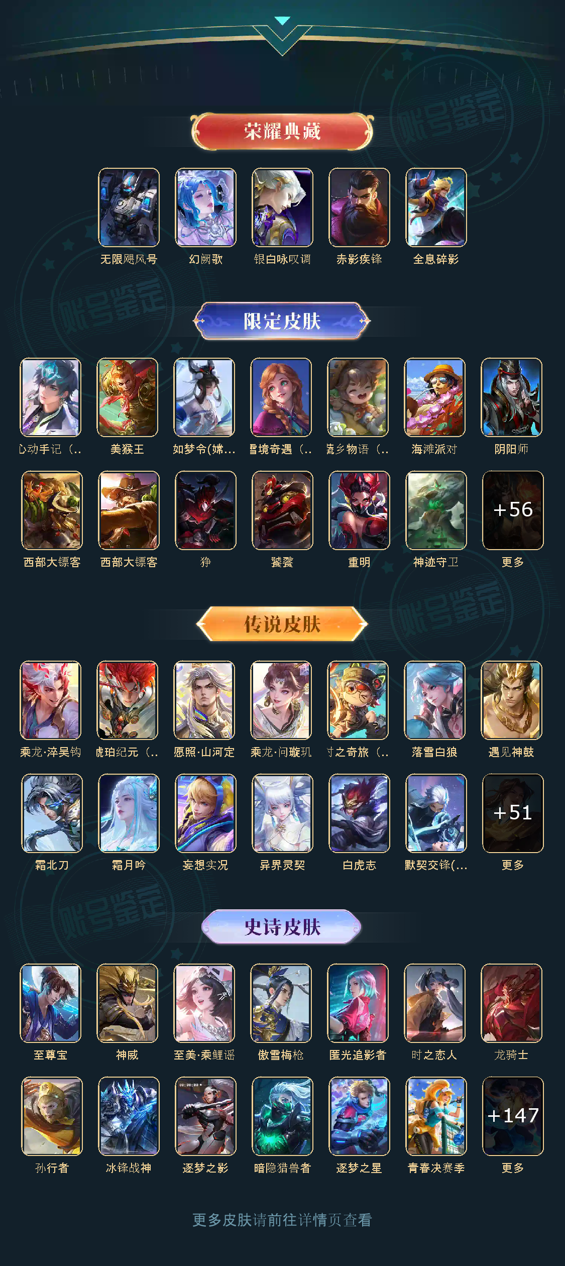贵族等级V10,英雄数量122,典藏皮肤数5,皮肤数量464,无限飓风号/全息碎影