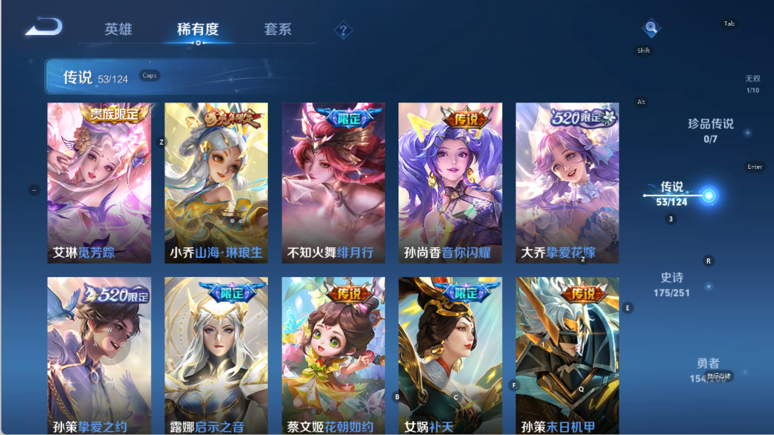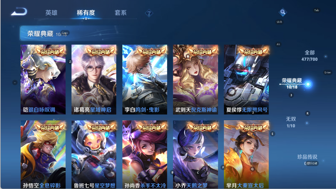 贵族等级V10,英雄数量124,典藏皮肤数10,皮肤数量477,天鹅之梦/杀手不太冷/大秦宣太后/星空梦想/无限飓风号/全息碎影/倪克斯神谕/鸣剑·曳影/星域神启