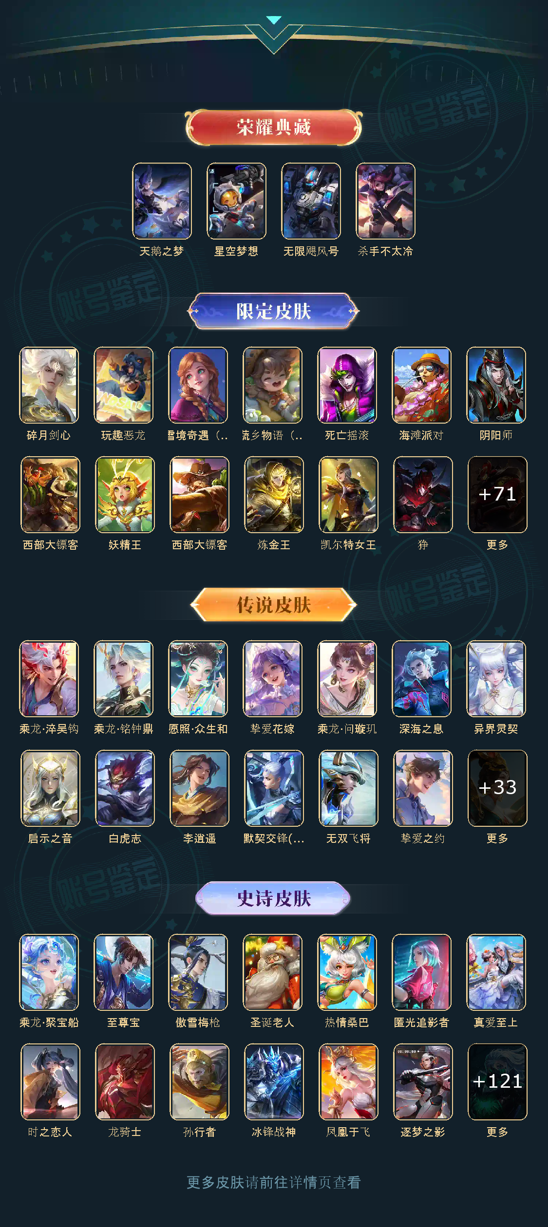 天鹅之梦,星空梦想,无限飓风号,碎月剑心,白虎志,李逍遥,默契交锋(花木兰),圣诞老人,热情桑巴,乘龙·问璇玑,乘龙·淬吴钩,乘龙·铭钟鼎,乘龙·聚宝船,至尊宝,真爱至上,愿照·众生和,匿光追影者,无双飞将,挚爱之约,挚爱花嫁,深海之息,补天,异界灵契,启示之音,神树通天,傲雪梅枪