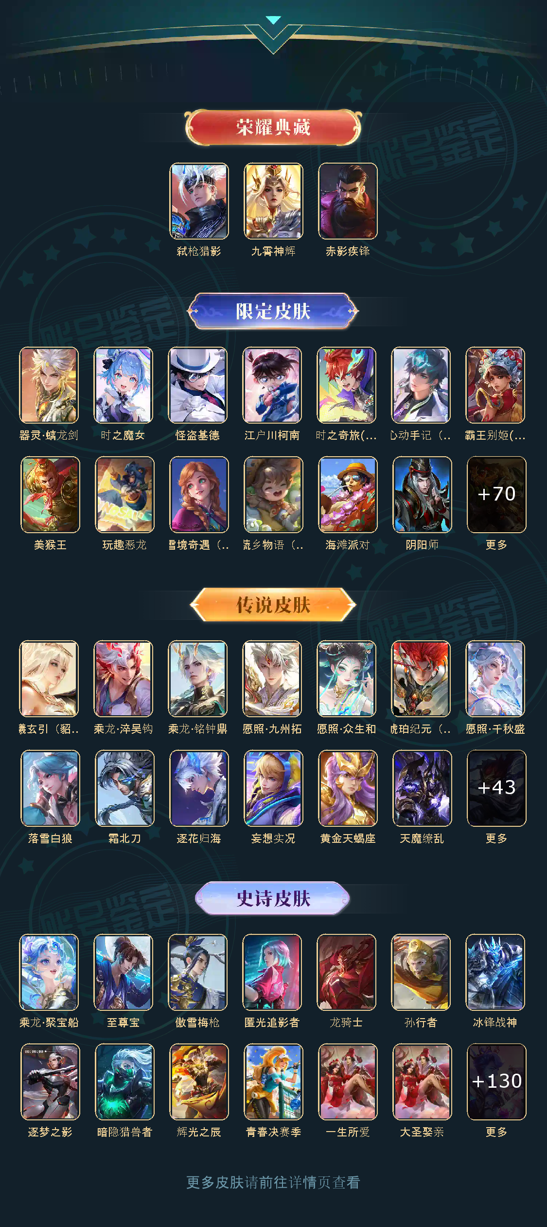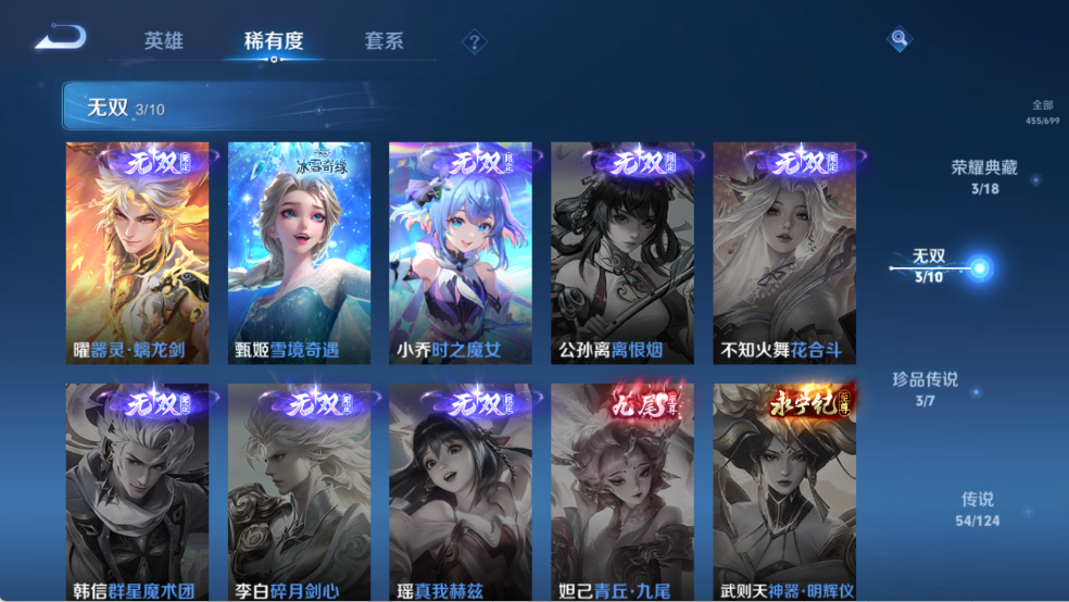 贵族等级V10,英雄数量124,典藏皮肤数3,皮肤数量455,
