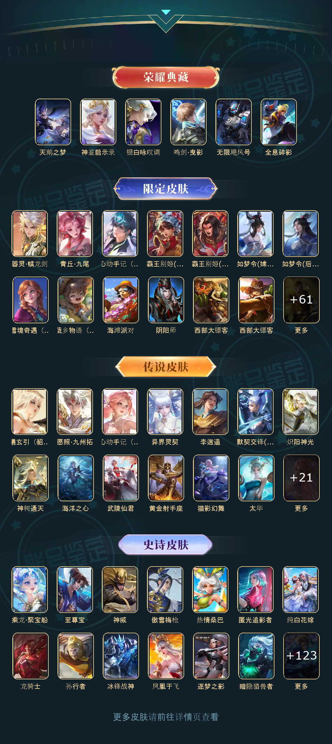 贵族等级V10,英雄数量123,典藏皮肤数6,皮肤数量414,天鹅之梦/无限飓风号/全息碎影/鸣剑·曳影