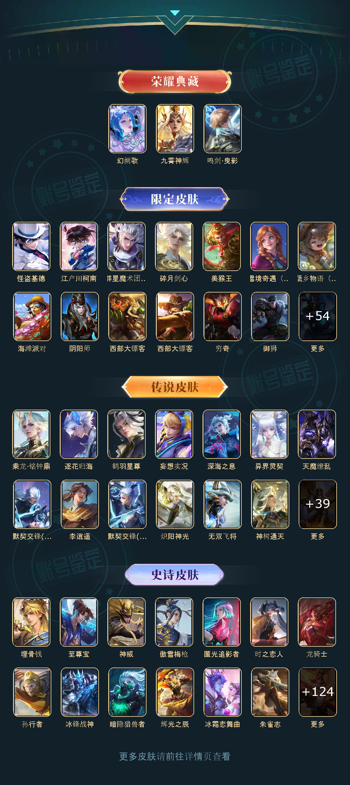 贵族等级V10,英雄数量124,典藏皮肤数3,皮肤数量431,鸣剑·曳影