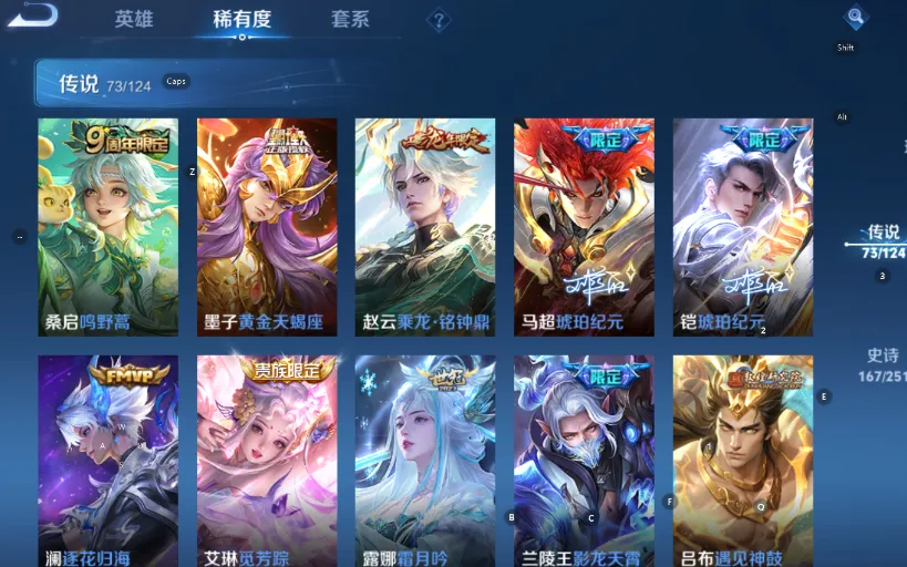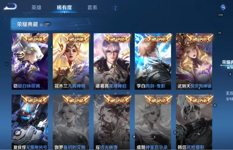 贵族等级V10,英雄数量125,典藏皮肤数6,皮肤数量508,