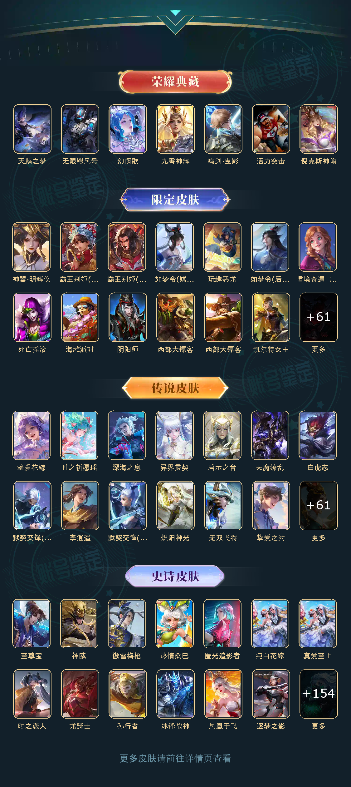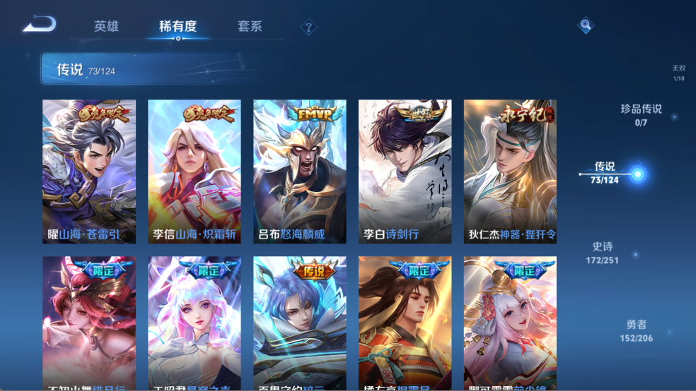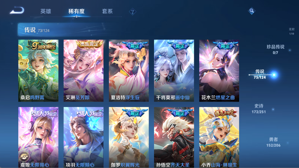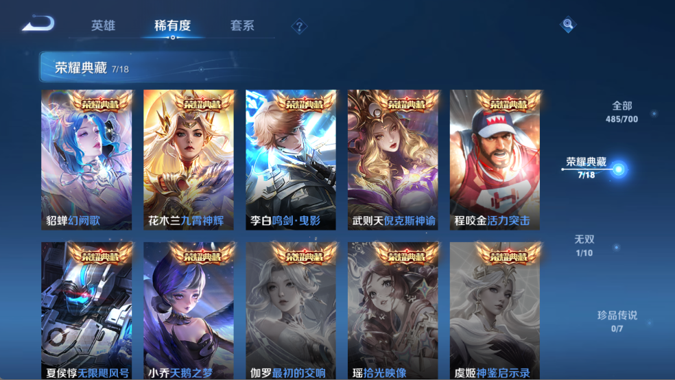 贵族等级V10,英雄数量123,典藏皮肤数7,皮肤数量485,