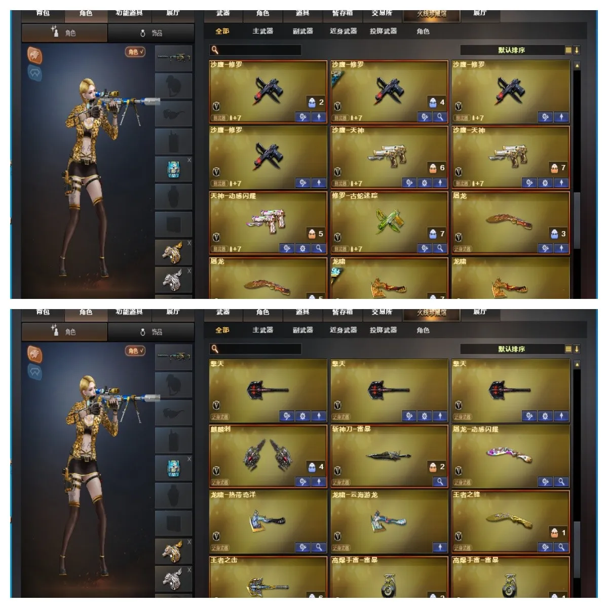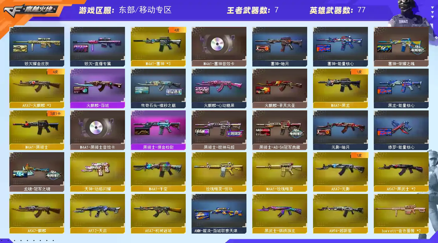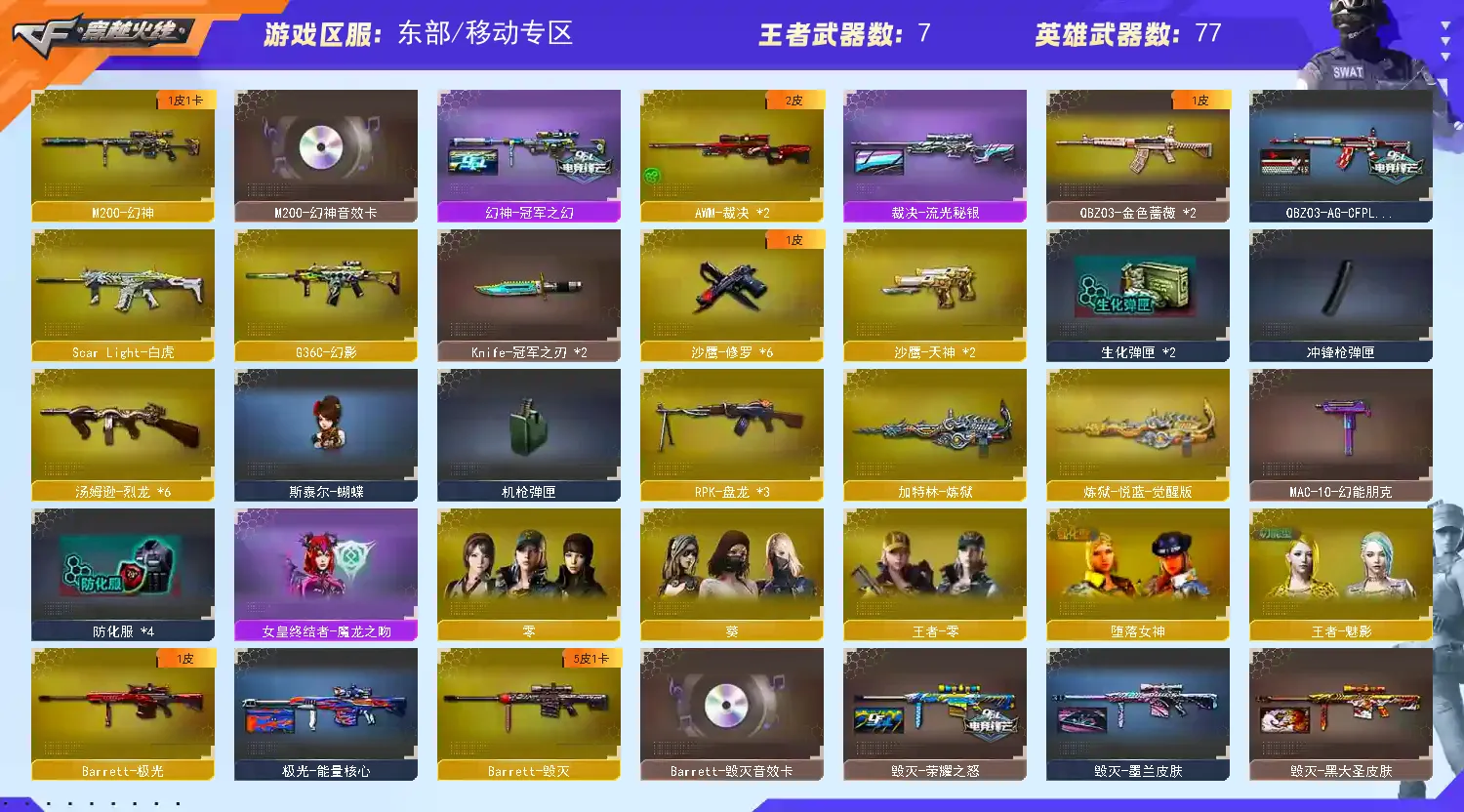 【移动专区-移动专区】2把冠军之刃! 71V10王者2炫金VIP6【主武器类型】 M200-幻神 Scar-白虎 Barrett-毁灭 Barrett-极光 AWM-裁决 王者之魄觉醒版 M4A1-雷神 *2 QBZ03-金色蔷薇 *2 王者之武觉醒版 M4A1-黑龙 M4A1-黑骑士 M4A1-千变 AK47-火麒麟 *3 AK47-无影 AK47-黑武士 *2 黑武士-锦绣游龙 AK47-麒麟 AK47-机械迷城 AK12-天启 AN94-超新星 超新星-热带奇洋 烈火动感闪耀 汤姆逊-烈龙 *6 斯泰尔-蝴蝶 RPK-盘龙 *3 炼狱悦蓝觉醒版 加特林-炼狱 AWM-天龙 炫金火麒麟 炫金雷神 C.A.T M4A1-玫瑰精灵 Barrett金色蔷薇 *2 AA12-擎天柱 QBZ03-吕布 黄金AK 闪光弹-云龙 高爆手雷雷暴 *3 闪光弹雷暴 *3 烟雾弹雷暴 *3 动感闪耀手雷 手雷-热带奇洋 【王者武器】 玫瑰精灵-悦动 王者之魄闪光弹 【副武器类型】 沙鹰-修罗 *6 修罗-古蛇迷踪 沙鹰-天神 *2 天神动感闪耀 Cfcolt1911大黄蜂 【近身武器类型】 Knife-冠军之刃 王者之锋觉醒版 屠龙 *2 屠龙动感闪耀 龙啸 *2 龙啸-热带奇洋 麒麟刺 王者之击觉醒版 擎天 *3 斩神刀-雷暴 荣耀之证 猫猫手套 夺魂 【稀有角色】 王者-魅影 王者-零 职业选手 葵 零 奇洋探员 乔伊教练 兔囡囡 兰海滩派对 兰新年限定 麻雀 堕落女神 龙儿-小淘气 蜀雪 潘多拉X 暗夜X 铁骑荣耀 幻影 堕天使 复仇者 超级护目镜 闪光护目镜 超级对讲机 超级背包 炫彩背包 【武器皮肤及道具】 幻神音效卡 幻神-冠军之幻 QBZ03-AG-CFPLS19冠军 雷神-荣耀之魄 雷神-暗月 雷神-能量核心 火麒麟-心动糖果 传奇石头-横秒之巅 火麒麟-CFSTAR 火麒麟-平天大圣 毁灭-荣耀之怒 毁灭-墨兰 毁灭-直播专属 毁灭耀金 黑骑士-战神马超 黑骑士-AG-S4冠军典藏 黑龙-能量核心 裁决-流光秘银 天龙-CFSTAR 极光-能量核心 M4A1-千变-孔明 修罗-CFSTAR 龙啸-冠军之啸 毁灭音效卡 黑骑士音效卡 雷神音效卡 【稀有套装】
