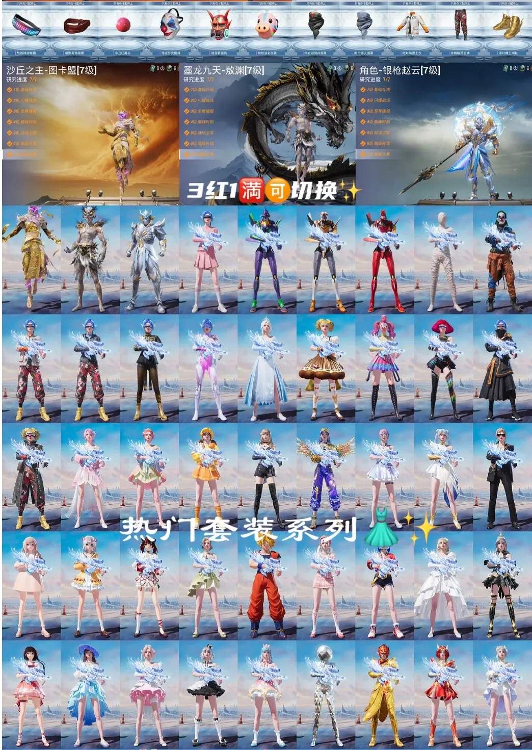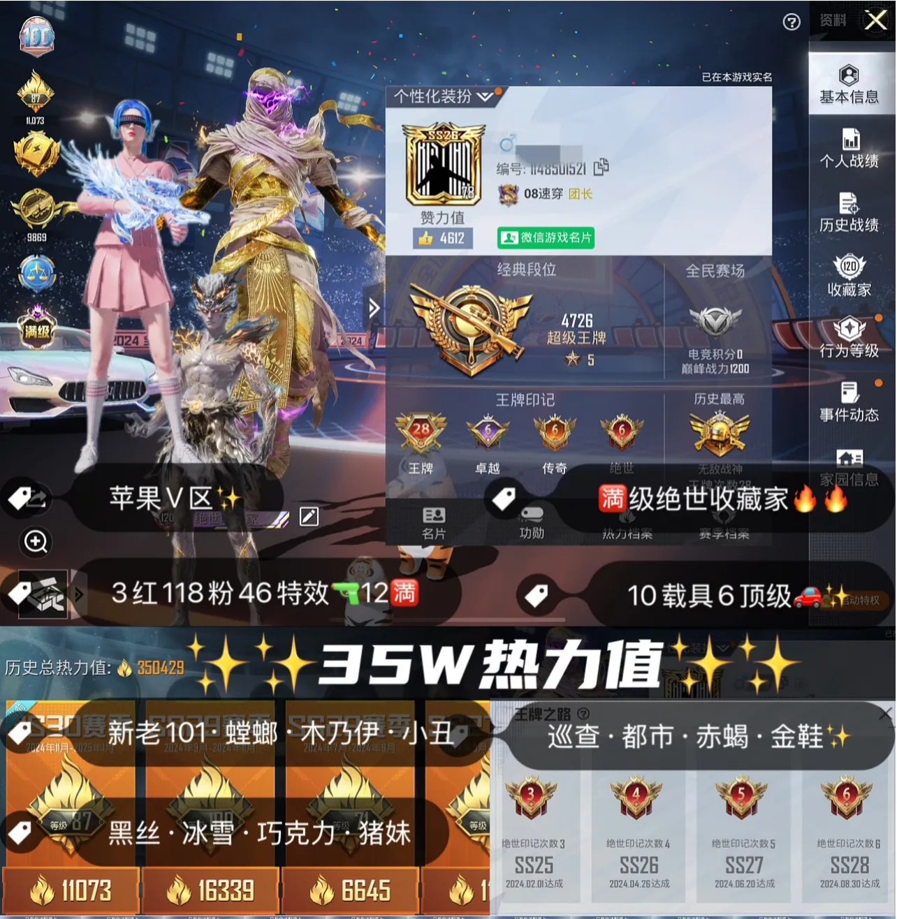 满级沙丘之主,满级木乃伊✨墨龙九天✨赵**✨老101✨3螳螂✨木乃伊✨小丑✨黑丝✨巡查衣✨黑丝✨赤蝎金鞋都市✨7把9级枪✨118粉46特10车✨全素材✨满级玛莎✨诡面斩面具