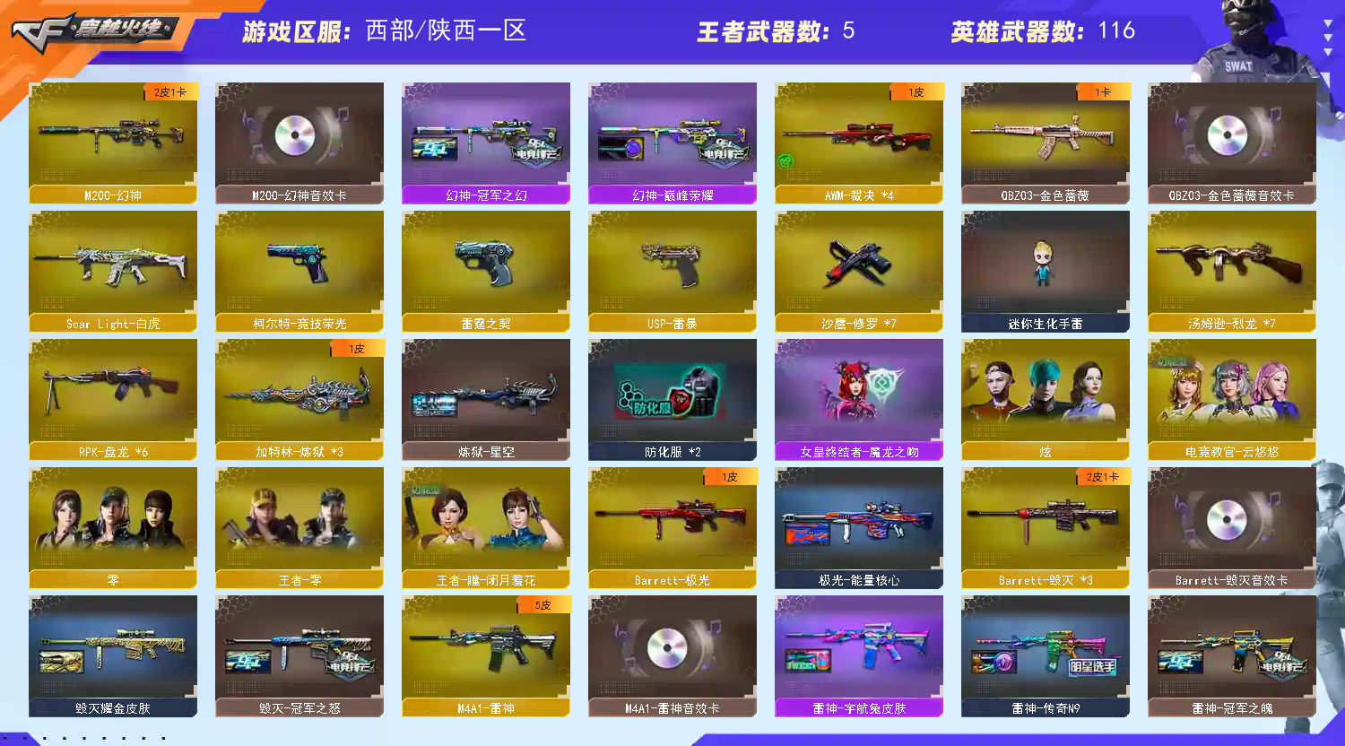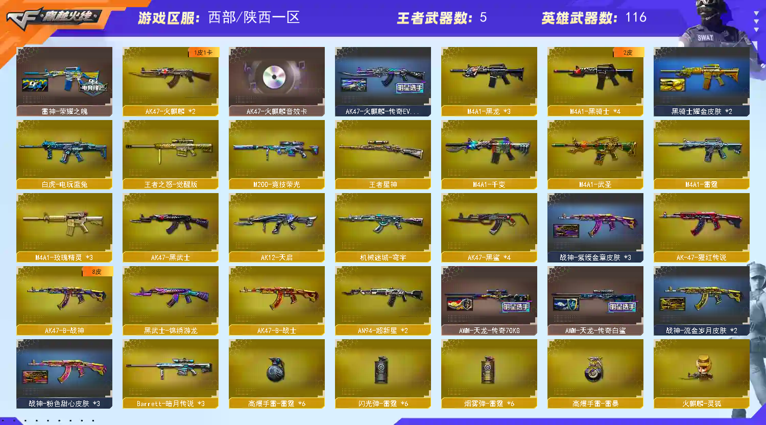 本游戏账号:英雄武器114个; 王者武器13个。 装备不多,但是主武器、副武器、近身武器够用 拥有完美游戏体验。,特殊装备有:闪光弹-竞技荣光、麒麟刺、USP-雷暴、烟雾弹-竞技荣光、擎天-竞技荣光、柯尔特-竞技荣光、M200-竞技荣光、加特林-炼狱、M200-幻神、AK47-火麒麟、M4A1-玫瑰精灵、炫金雷神、王者星神、王者之怒-觉醒版、炫金毁灭、王者之怒、王者之翼-觉醒版、火麒麟-灵狐、火麒麟-绝迹、王者-瞳-闭月羞花、职业选手、王者-零、等,随意畅选。