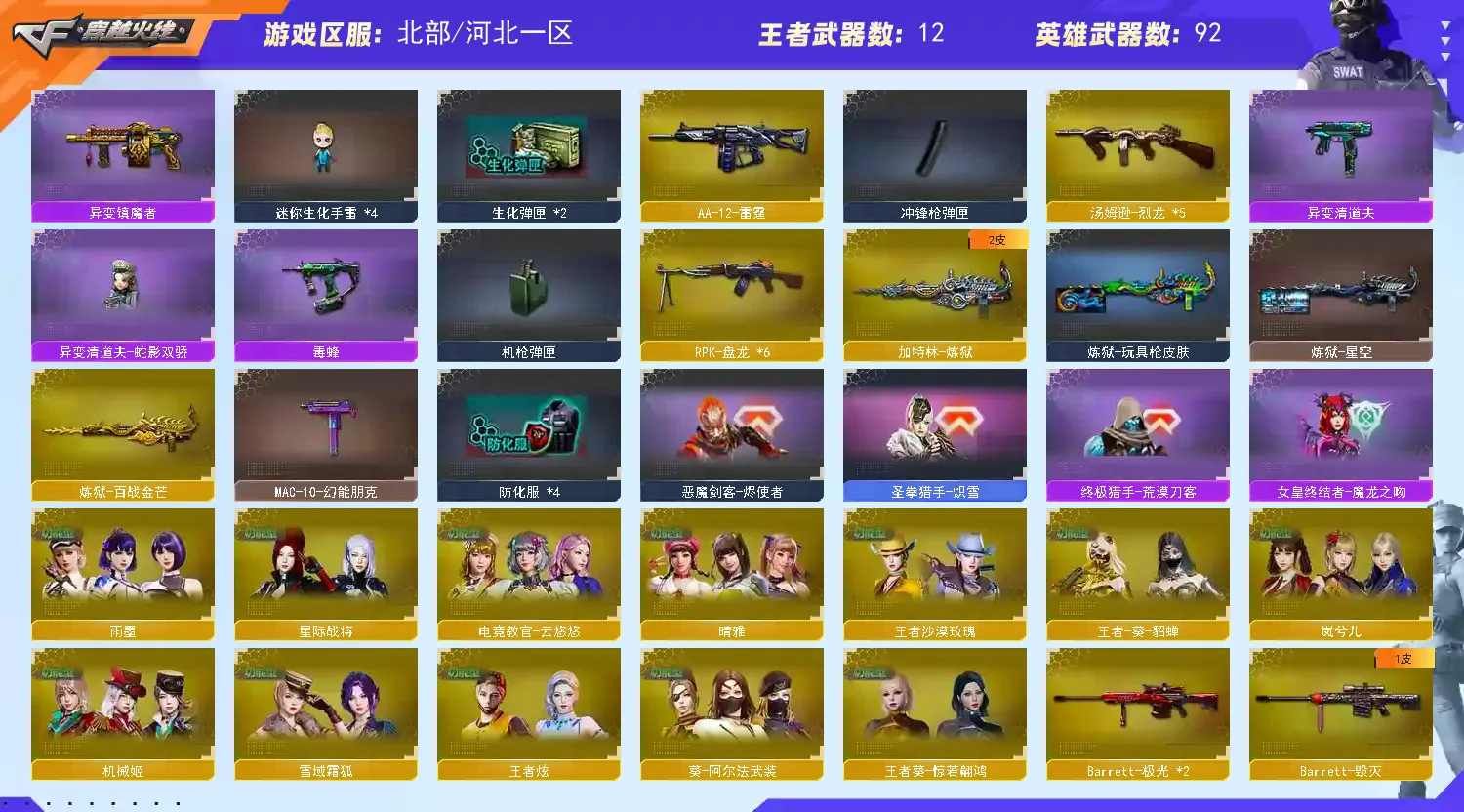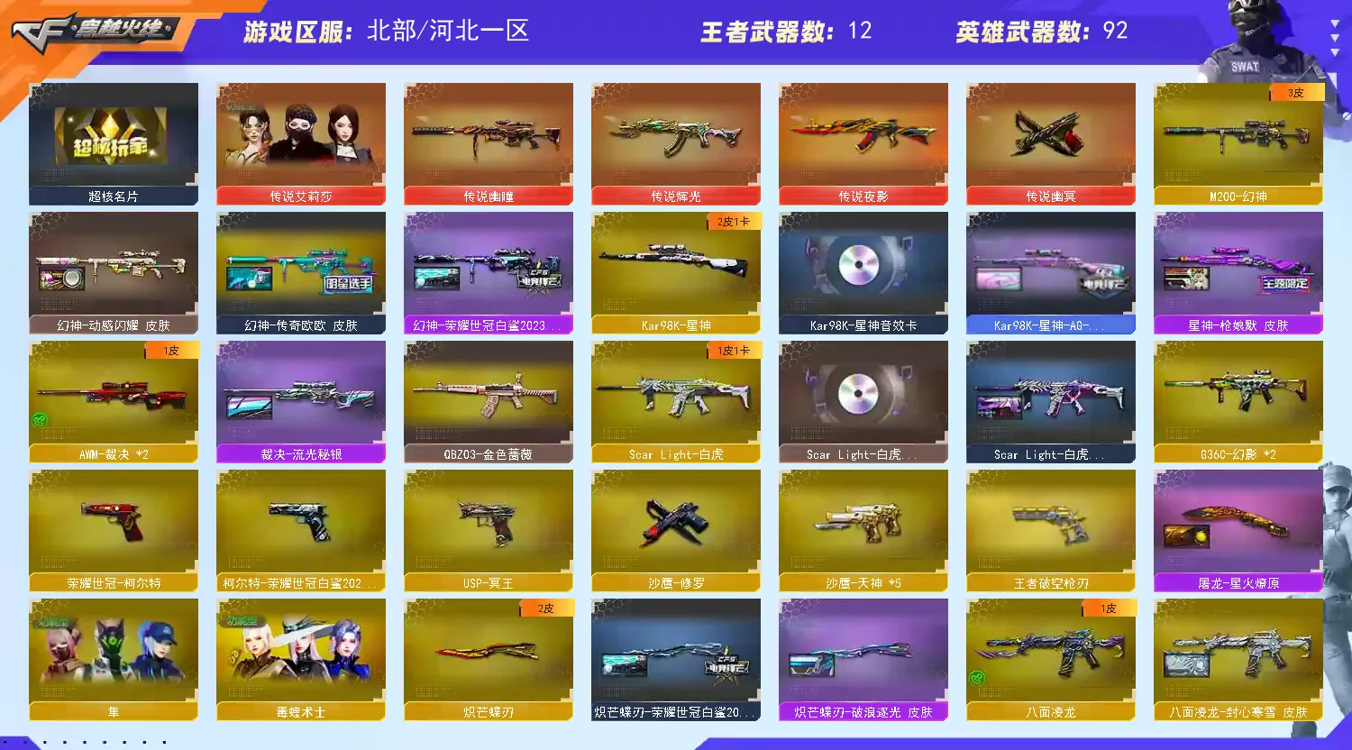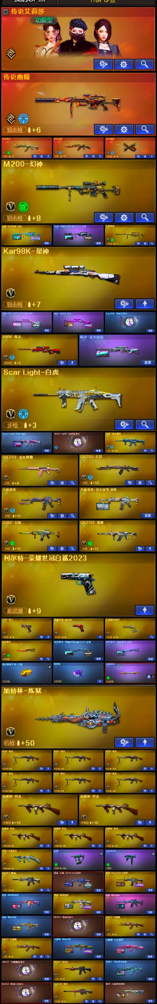 4防艾莉莎4防毒蝰术士4防隼4防云悠悠4防晴雅4防岚兮儿五传说幽瞳传说辉光传说夜影传说幽冥传说艾莉莎满级八面玲珑(封心寒雪)G36C幻影天罚银翼幻神(传奇欧欧/世冠白鲨)白虎三件套星神三件套(枪娘默/AG冠军)裁决流光秘银6烈龙6盘龙蝴蝶斯泰尔异变清道夫-蛇影双骄/毒蜂/异变清道夫/2世冠柯尔特蝴蝶刀(世冠白鲨/破浪逐光)USP冥王