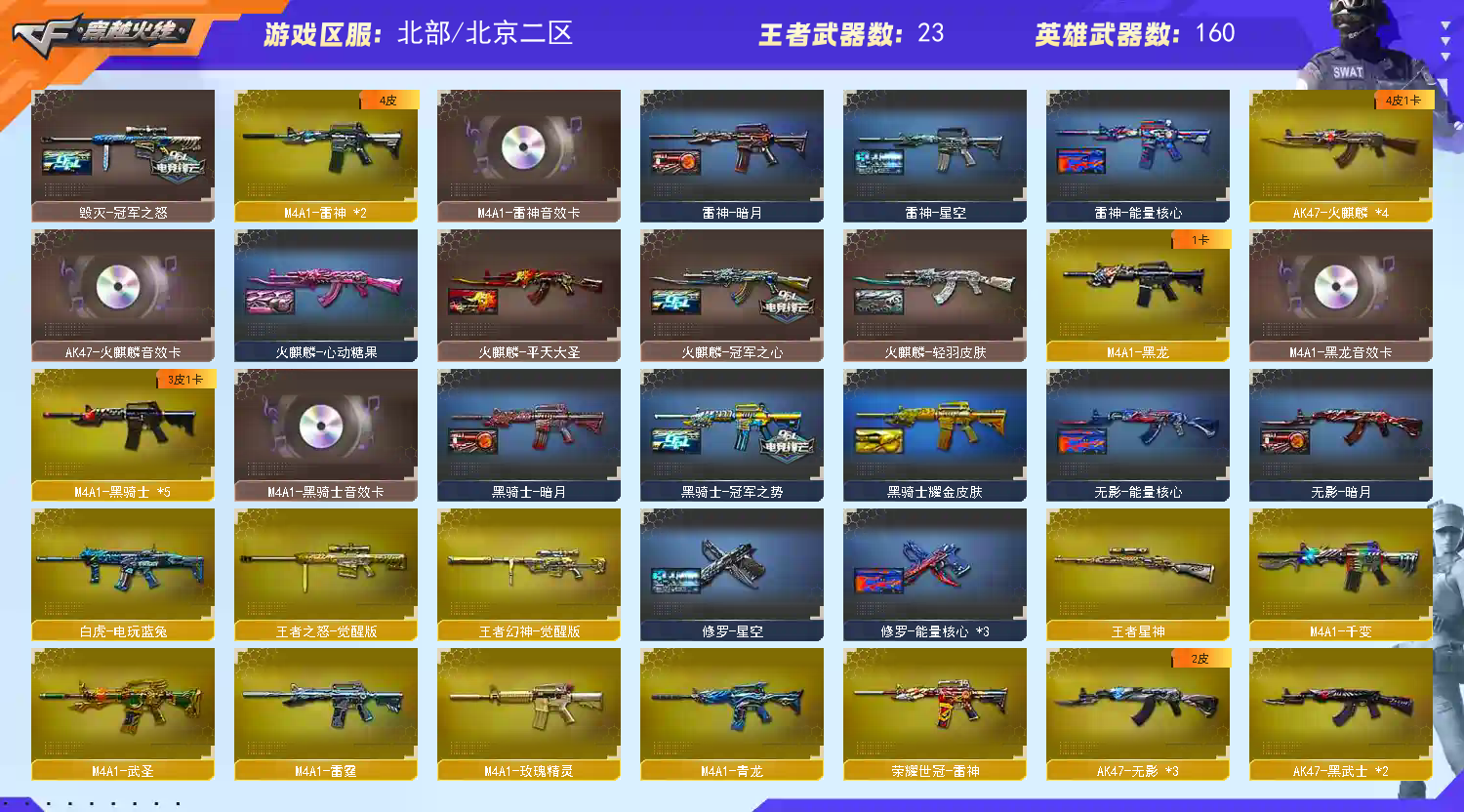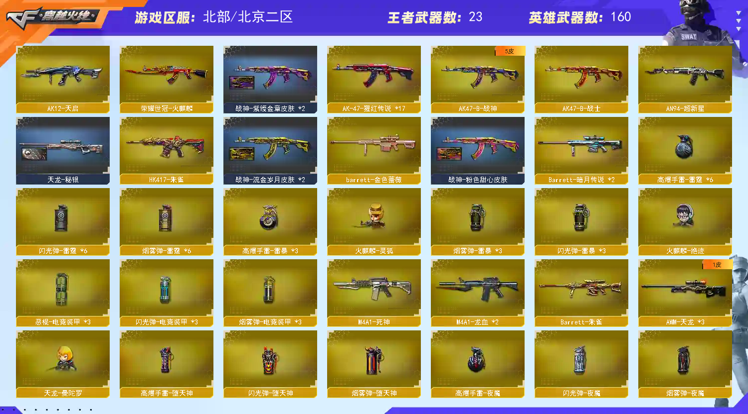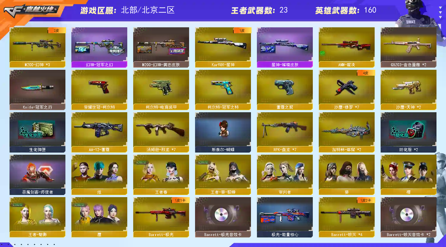 本游戏账号:英雄武器158个; 王者武器30个。 可以玩爆破号、生化号、双全装、稀有武器、等模式。装备不多,但是主武器、副武器、近身武器够用 拥有完美游戏体验。重要的是,特殊装备有:AK47-火麒麟、M200-幻神、荣耀世冠-火麒麟、荣耀世冠-柯尔特、荣耀世冠-龙啸、荣耀世冠-雷神、Barrett-朱雀、M4A1-黑骑士、M4A1-青龙、AK47-黑武士、AWM-天龙、Kar98K-星神、Barrett-毁灭、HK417-朱雀、麒麟刺-堕天神、闪光弹-堕天神、烟雾弹-堕天神、AA-12-雷霆、QBZ03-金色蔷薇、加特林-炼狱、M4A1-雷霆、雷霆之契、雷霆之锋、AN94-超新星、M4A1-玫瑰精灵、M4A1-雷神、麒麟刺、M4A1-黑龙、王者之势-觉醒版、王者星神、王者之魄高爆手雷、王者火魄、王者之魄闪光弹、炫金骑士、王者之武、王者之锋-觉醒版、王者之戮、王者之锋、王者幻神-觉醒版、炫金毁灭、王者之灵、王者之城、炼狱-悦蓝、王者之武-觉醒版、王者之魄-觉醒版、王者之心、王者之力