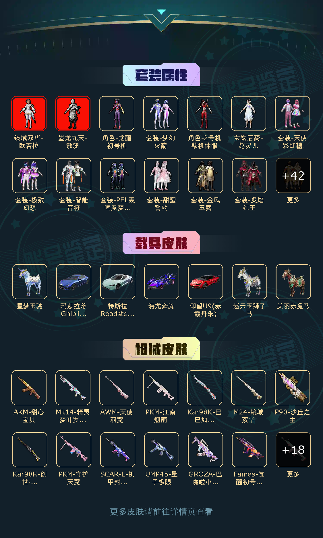 7载具,403套装,21王牌印记,卓越王牌18星历史最高段,202259热力值 Famas-初号机 觉醒Ver./AKM-甜心宝贝/AKM-绿萝繁花/M416-电玩时刻/M762-电糖天使/AUG-甜心首席/GROZA-巴啦啦小魔仙/M762-激战未来/Famas-觉醒初号机/M416-心之恋语/M16A4-葫芦兄弟/M416-五爪金龙/AKM-炫紫旋律/M416-墨龙九天/GROZA-焦糖拿铁/SCAR-L-锦绣绵绵/SCAR-L-机甲封神/Mk14-精灵梦叶罗丽/PKM-守护天翼/PKM-江南烟雨/MG3-突变脉冲/DP-28-豹影疾电/UMP45-量子极限/Vector-灵感创作师/P90-沙丘之主/爆炸猎弓-拳皇·狂花道/烟雾弹-猫咪绅士/破片手榴弹-粉粉猫爪/Kar98K-巳巳如意/Kar98K-创世·救赎/M24-镜域双华/AWM-天使羽翼/玛莎拉蒂Ghibli(蓝)/特斯拉Roadster(水滴蓝)/海龙奔腾/仰望U9(赤霞丹朱)/星梦玉骢/关羽赤兔马/赵云玉狮子马/照夜玉狮子/