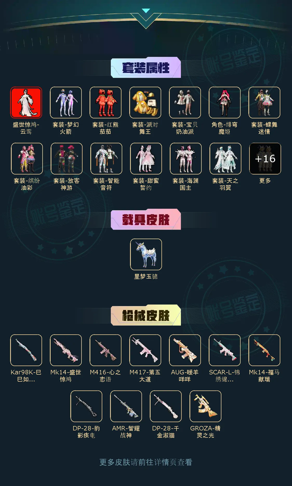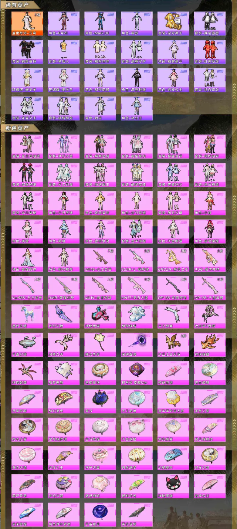 【稀有资产】盛世惊鸿-云鸾[3级]/角色-8号机/角色-Mark.06/角色-零款战斗服/套装-派对舞王/套装-胖达圆圆/套装-暗影哥特/套装-龟仙人/套装-糯粉咩咩/套装-晶辉守护/角色-粉雾星云/套装-红熊茄茄/玩偶服-懒羊羊/玩偶服-美羊羊/角色-都市丽猫/角色-摩登魅猫/角色-临安公主/套装-纯白跃动/套装-龙宫之主/套装-绒绒粉兔/角色-银尘/角色-冰公主