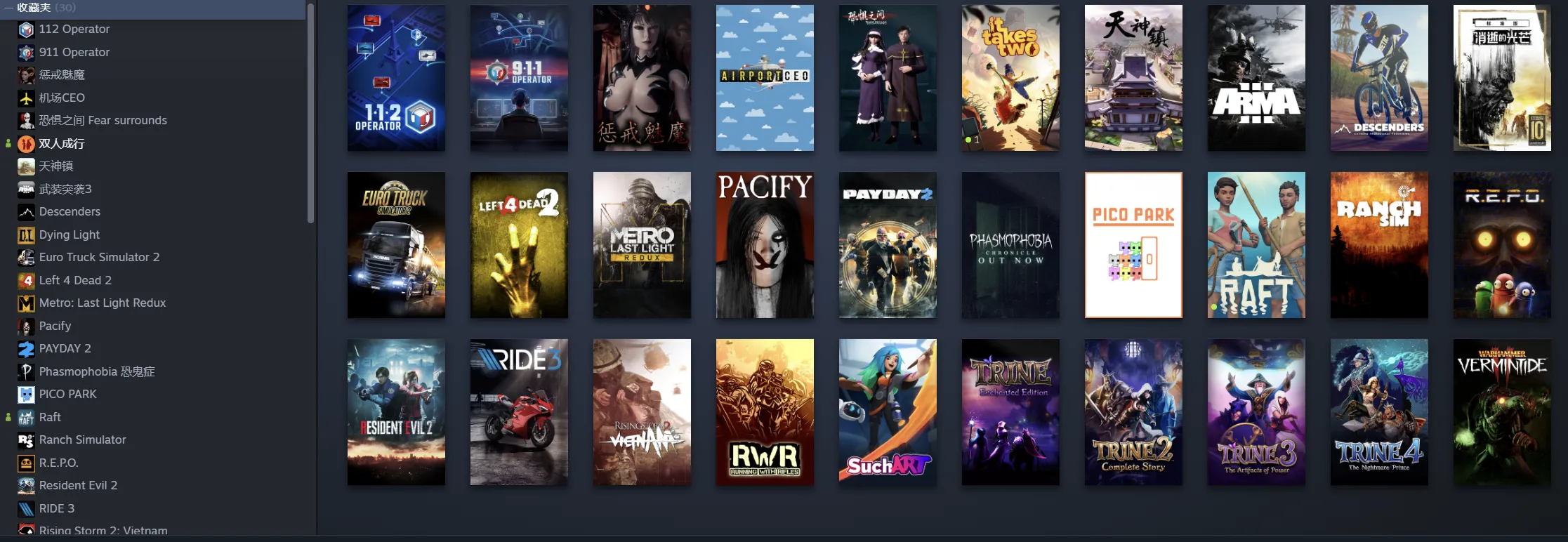 林间小世界(Tiny Glade)、PEAK、收获日2、求生之路2、双人成行、安抚(Pacify)、恐惧之间、幽灵恐怖/恐鬼症、消逝的光芒 (dying light)、求生之路2、生化危机2重置版 (Resident Evil 2)、R.E.P.O.、木筏生存 (raft)、SuchArt: 艺术家模拟器、惩戒魅魔、小兵步枪、公园(pico park)、天神镇、欧洲卡车模拟2、战锤末日鼠疫2、牧场模拟器、机场CEO、速降王者、极速骑行3、911接线员、112接线员、风起云涌2:越南、地铁:最后的曙光、武装突袭3 (arma3)、三位一体合集(三位一体、三位一体2完整故事、三位一体3权利圣器、三位一体4梦魇王子)