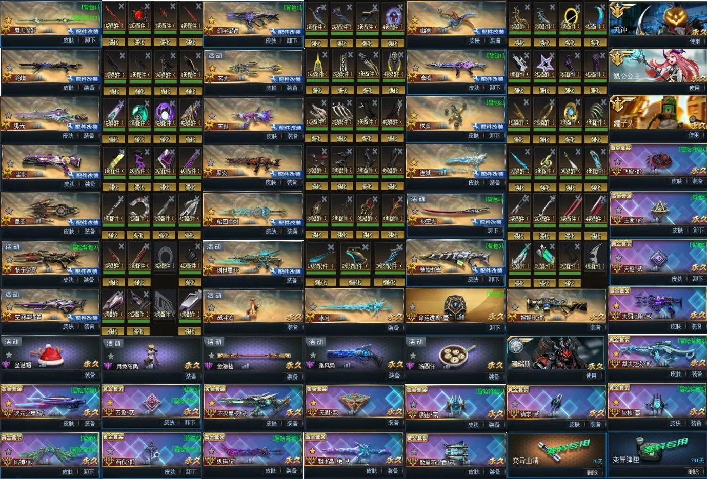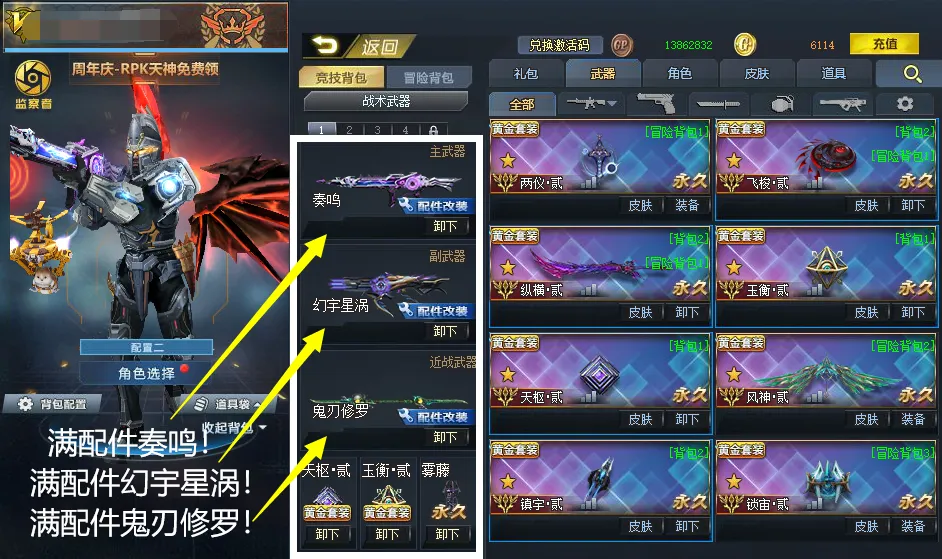 配件:满鬼刃修罗!满幻宇星涡!满幽冥!满绝境!双玄天!满奏鸣!满弧光!满末世!满伏虎!满尘羽!满黑炎!【终极•满连城】!满盖亚!满轮回之刺!满极空刃!满创世星环等