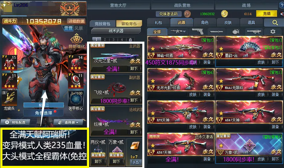 全满天赋•阿瑞斯!神谕终焉+墨韵合!魅影贰!万象贰!满鬼刃修罗!冒险1000万战力!变异235血量!