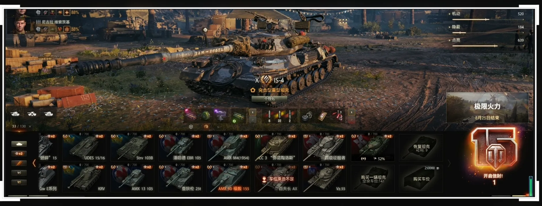 坦克世界35X出租不用押金,10级:新增183和4005。超征,轮子,牛头人,豹一,115a,伏羲155,121b等。9级31台。9金8台:眼镜蛇,T55a,夏尔75,坤泽试验,ae1期,4号先进等。8金:27台:BZ-176等。红紫和3级橙装30多个