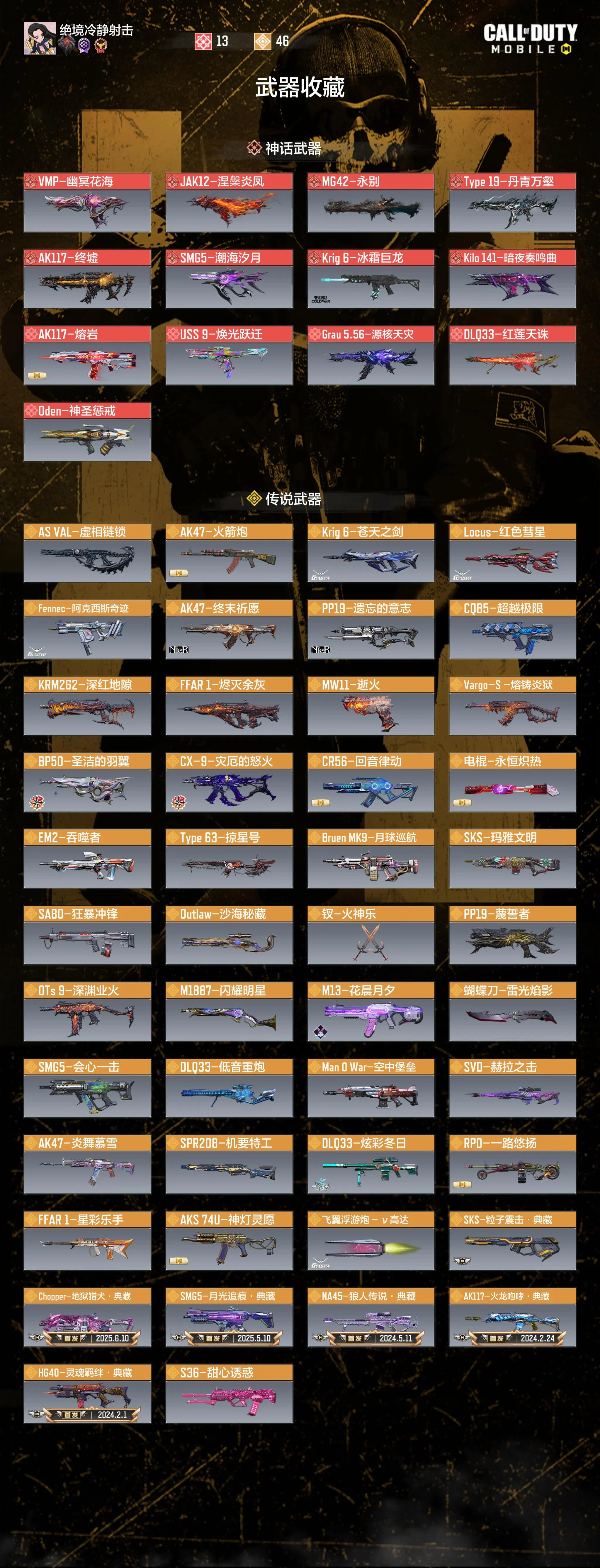 ASVAL-虚相链锁 AK47-火箭炮 Krig6-苍天之剑 Locus-红色彗星 Fennec-阿克西斯奇迹 AK47-终末祈愿 PP19-遗忘的意志 CQB5-超越极限 KRM262-深红地隙 FFAR1-烬灭余灰 MW11-逝火 Vargo-S-熔铸炎狱 BP50-圣洁的羽翼 CX-9-灾厄的怒火 CR56-回音律动 电棍-永恒炽热 EM2-吞噬者 Type 63-掠星号 BruenMk9-月球巡航 SKS-玛雅文明 SA80-狂暴冲锋 Outlaw-沙海秘藏 钗-火神乐 PP19-蔑誓者 OTs9-深渊业火 M1887-闪耀明星 M13-花晨月夕 蝴蝶刀-雷光焰影 SMG5-会心一击 DLQ33-低音重炮 Man0War-空中堡垒 SVD-赫拉之击 AK47-炎舞慕雪 SPR208-机要特工 DLQ33-炫彩冬日 RPD-一路悠扬 FFAR1-星彩乐手 AKS74U-神灯灵愿 飞翼浮游炮-v高达 SKS-粒子震击·典藏 Chopper-地狱猎犬·典藏 SMG5-月光追痕·典藏 NA45-狼人传说·典藏 AK117-火龙咆哮·典藏 HG40-灵魂羁绊·典藏 S36-甜心诱惑