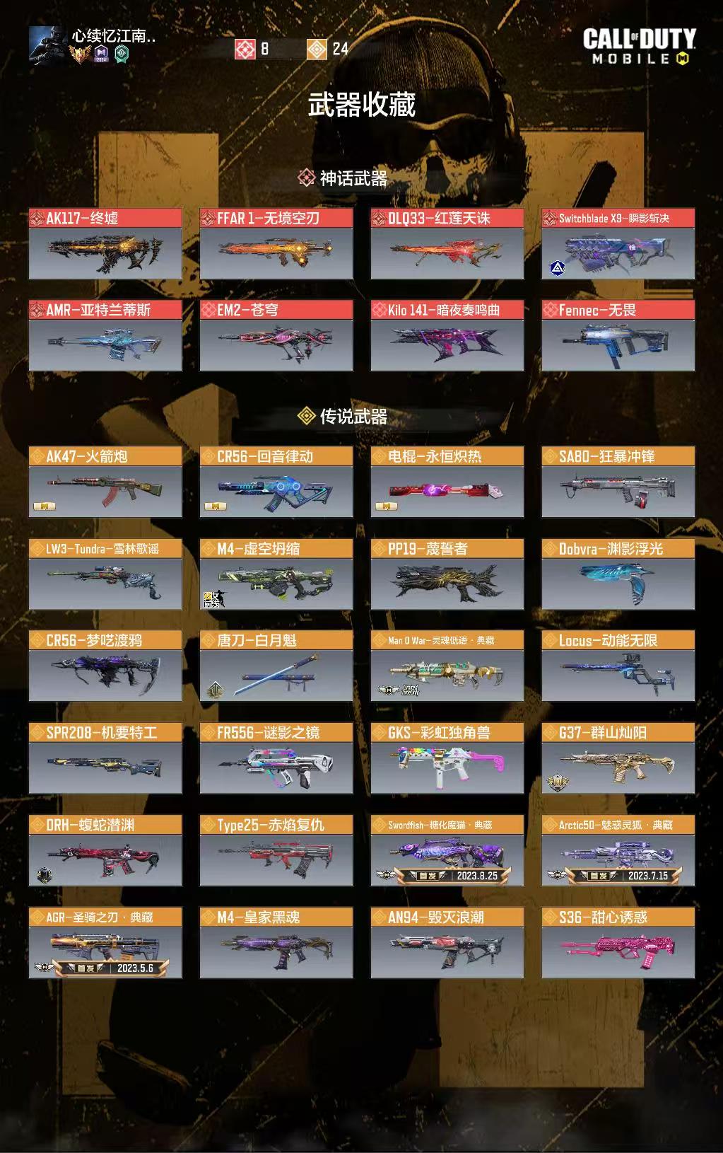 8神话武器,4典藏武器,24传说武器,1神话角色,0传说角色,0传说载具,典藏武器:Swordfish-糖化魔猫·典藏,AGR-圣骑之刃·典藏,Arctic50-魅惑灵狐·典藏,ManOWar-灵魂低语·典藏,神话武器:FFAR1-无境空刃,DLQ33-红莲天诛,AK117-终墟,AMR-亚特兰蒂斯,Kilo141-暗夜奏鸣曲,SwitchbladeX9-瞬影斩决,Fennec-无畏,EM2-苍穹,传说武器:DRH-蝮蛇潜渊,3-Tundra-雪林歌谣,CR56-梦呓渡鸦,AGR-圣骑之刃·典藏,Dobvra-渊影浮光,AN94-毁灭浪潮,AK47-火箭炮,FR556-谜影之镜,GKS-彩虹独角兽,电棍-永恒炽热,PP19-蔑誓者,Type25-赤焰复仇,56-回音律动,唐刀-白月魁,G37-群山灿阳,SA80-狂暴冲锋,ManOWar-灵魂低语·典藏,S36-甜心诱惑,Locus-动能无限,Swordfish-糖化魔猫·典藏,SPR208-机要特工,M4-虚空坍缩,M4-皇家黑魂,Arctic50-魅惑灵狐·典藏,传说角色:薇刺客-碧海光