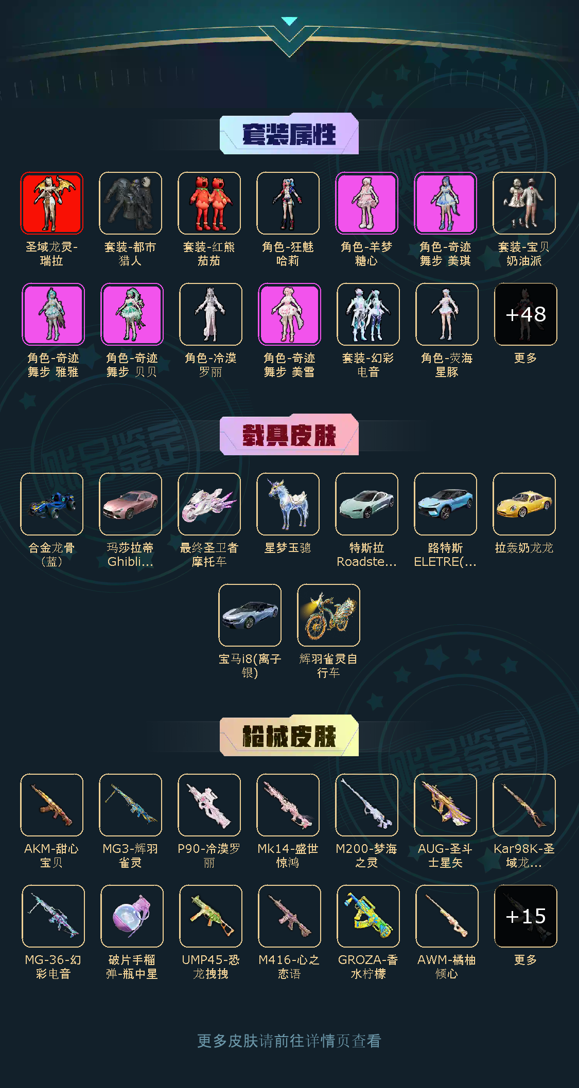 59粉,9载具,344套装,20王牌印记,超级王牌19星历史最高段,192148热力值 平底锅-喜羊羊与灰太狼/平底锅-林间仙鹿/Vector-绯穹魔姬/AKM-甜心宝贝/M762-激战未来/GROZA-香水柠檬/M416-心之恋语/AUG-圣斗士星矢/SCAR-L-青春物语/M417-第五大道/Mk14-盛世惊鸿/MG3-辉羽雀灵/MG3-梦幻舞会/MG-36-幻彩电音/DP-28-千金淑猫/DP-28-豹影疾电/汤姆逊-怪笑疯兔/P90-金丰海韵/AKS-74U-星穹咏叹调/P90-冷漠罗丽/Vector-环太平洋/UMP45-恐龙拽拽/JS9-奇迹舞步/破片手榴弹-瓶中星球/爆炸猎弓-拳皇·狂花道/Kar98K-圣域龙灵/AWM-橘柚倾心/AMR-智耀战神/M200-梦海之灵/特斯拉Roadster(水滴蓝)/玛莎拉蒂Ghibli(粉)/拉轰奶龙龙/路特斯ELETRE(冰川蓝)/合金龙骨(蓝)/宝马i8(离子银)/星梦玉骢/辉羽雀灵自行车/最终圣卫者摩托车/
