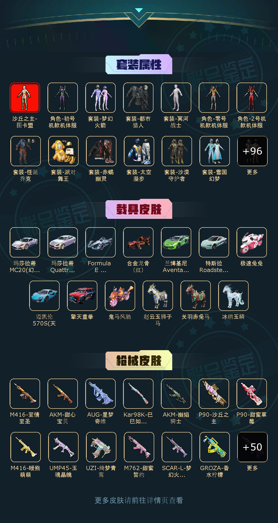 102粉,13载具,604套装,32王牌印记,无敌战神历史最高段,336411热力值 平底锅-仲夏莫吉托/平底锅-林间仙鹿/AKM-盖世英雄/AKM-甜心宝贝/SCAR-L-梦幻火箭/AUG-星梦奇缘/AKM-绿萝繁花/M416-风花雪月/M416-电玩时刻/AUG-星之彼岸/SCAR-L-甜梦小狐/GROZA-巴啦啦小魔仙/GROZA-香水柠檬/M416-暖熊萌萌/AKM-幽焰骑士/M416-心之恋语/SCAR-L-纯梦嫁纱/AKM-炫紫旋律/SCAR-L-青春物语/SCAR-L-锦绣绵绵/M416-至情至圣/AUG-妙趣可丽/M762-甜蜜誓约/M762-苔丝玫瑰/SPAS-12-蜜语绒猫/SPAS-12-音爆索尼克/S12K-海渊国主/M417-第五大道/SKS-诡面斩/Mini14-绚金瑰梦/SLR-暗夜玫瑰/VSS-烈焰拳霸/MK20-H-海螺星光/DP-28-暗夜鎏金/DP-28-扶摇飞仙/M249-彩虹甜喵/MG3-梦幻舞会/PKM-天星战神/DP-28-枪炮玫瑰/MG3-洛神天依/M249-蓝莓炮弹/DP-28-豹影疾电/UZI-绮梦青鸾/Vector-飒粉甜心/汤姆逊-怪笑疯兔/Vector-红伞翩翩/P90-甜蜜草莓/汤姆逊-荒漠赏金/P90-粉樱探戈/Vector-环太平洋/UZI-筑梦精灵/野牛-青空秋雨/UMP45-恐龙拽拽/P90-沙丘之主/UMP45-玉魂晶魄/爆炸猎弓-雪梅暗香/Kar98K-伏魔团/AWM-花间之火/Kar98K-巳巳如意/AWM-橘柚倾心/Kar98K-未来歌姬/M24-星之信仰/M24-莲影清波/特斯拉Roadster(水滴蓝)/玛莎拉蒂Quattroporte(幻星粉)/擎天重拳/鬼马风驰/Formula E Gen2(巅峰兰)/合金龙骨(红)/兰博基尼Aventador(翡翠绿)/玛莎拉蒂MC20(幻星粉)/迈凯伦570S(天际蓝)/冰绡玉鳞/关羽赤兔马/赵云玉狮子马/照夜玉狮子/极速兔兔/