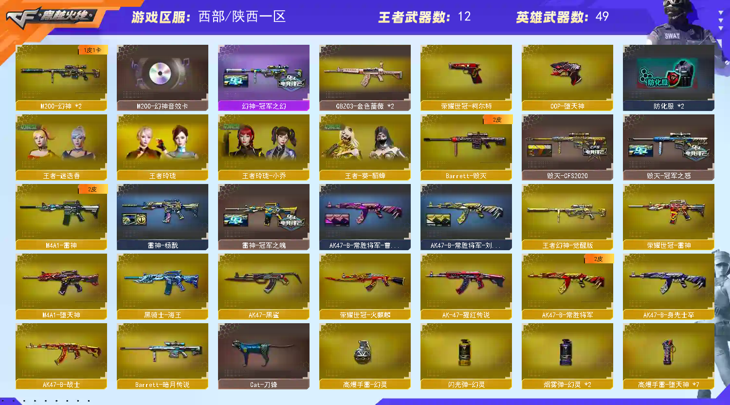 幻神+冠军之幻+音效卡/王者零传说之路/貂蝉/玲珑/迷迭香/小乔 毁灭/王者之心/啸/击觉醒版 QBZ03-金色蔷薇 M4A1-雷神 荣耀世冠-雷神 荣耀世冠-火麒麟 COP 357-青龙 荣耀世冠-柯尔特