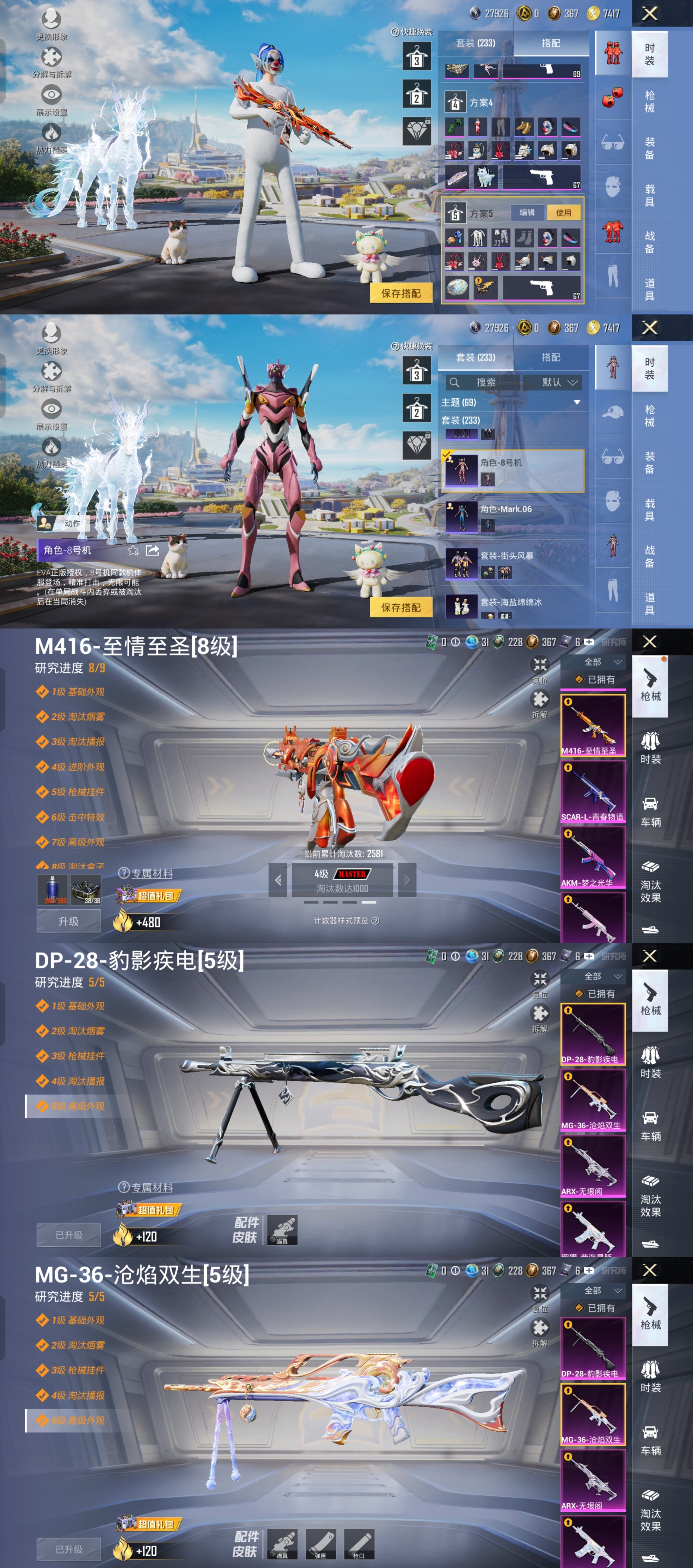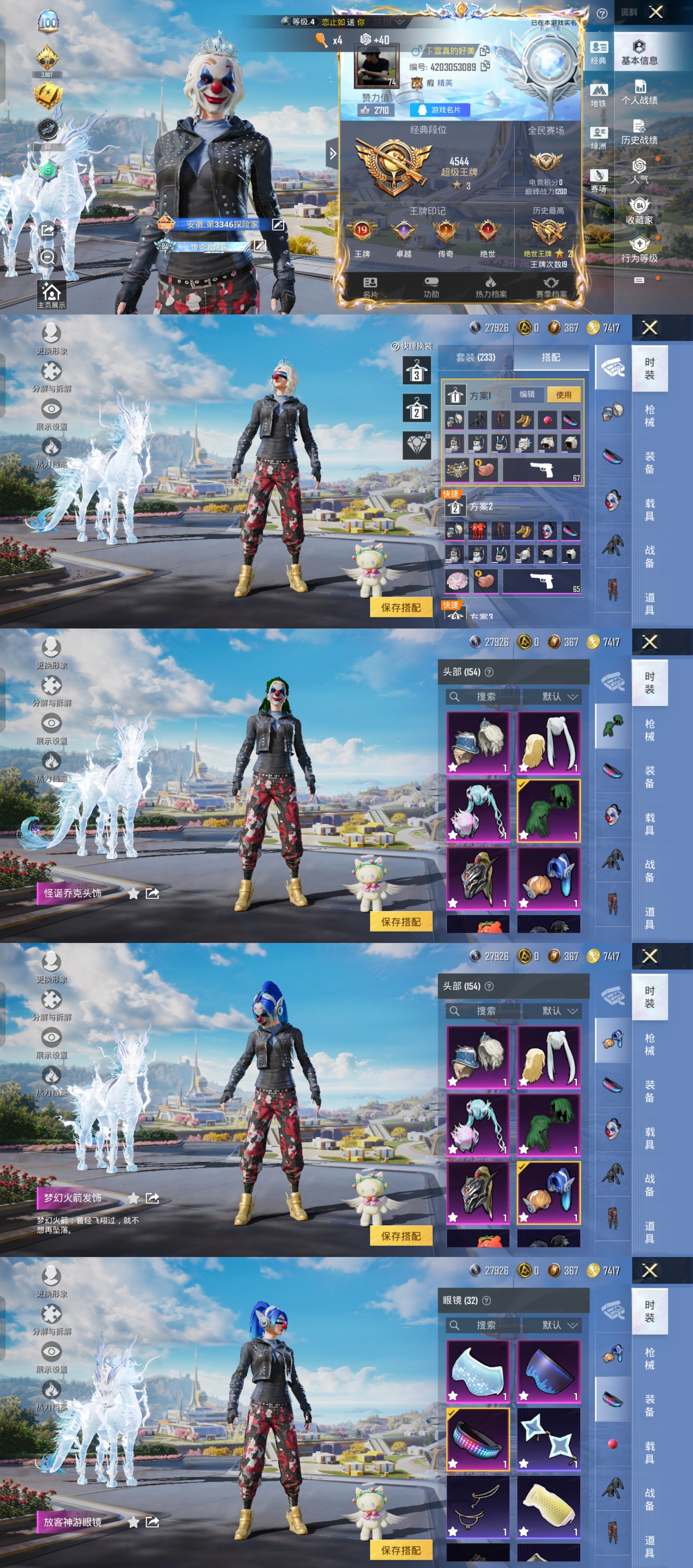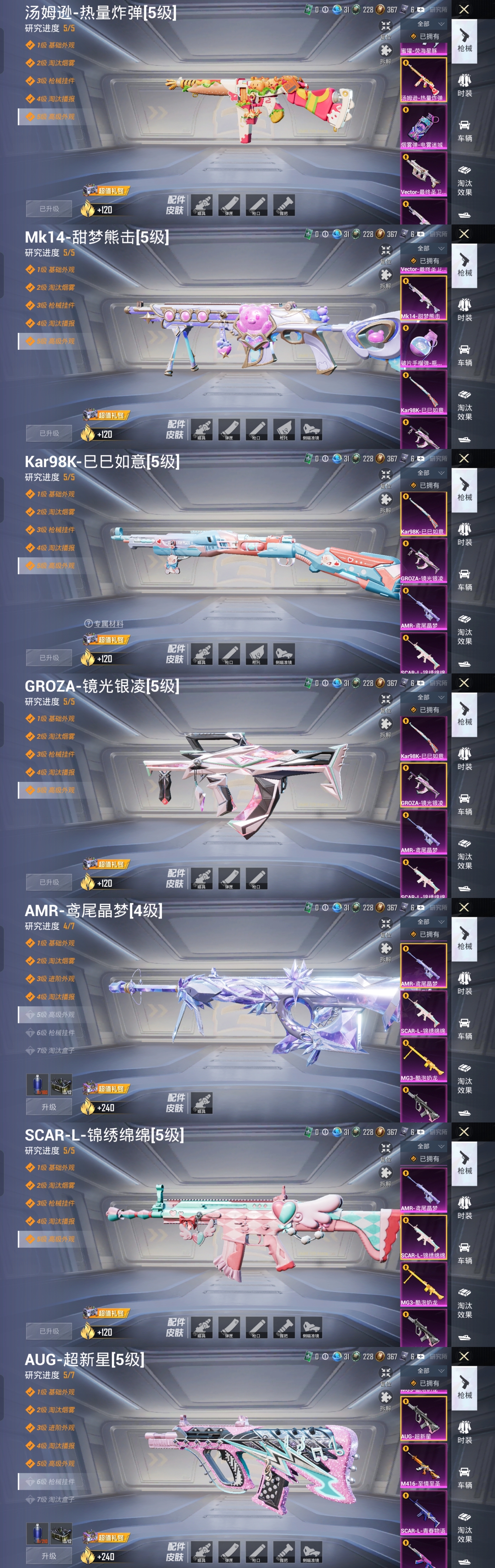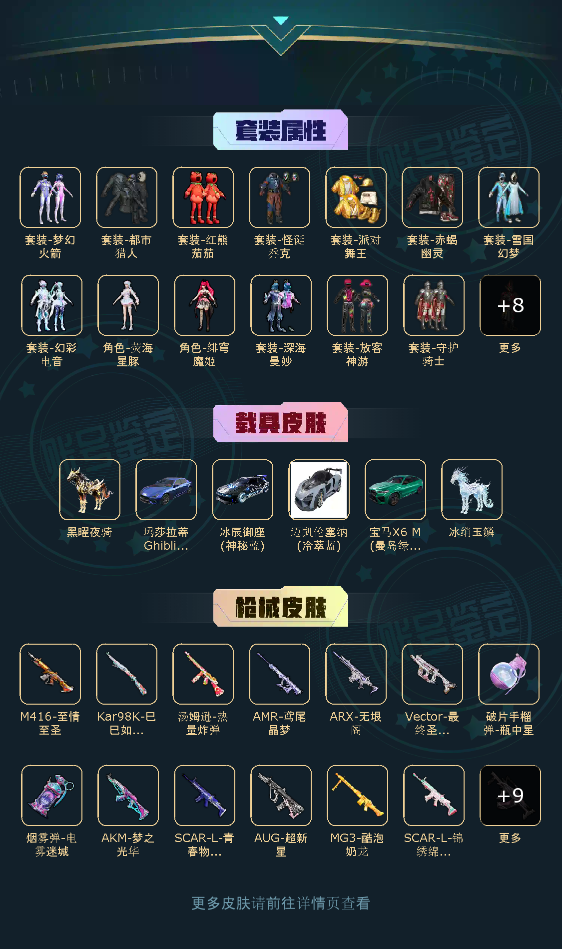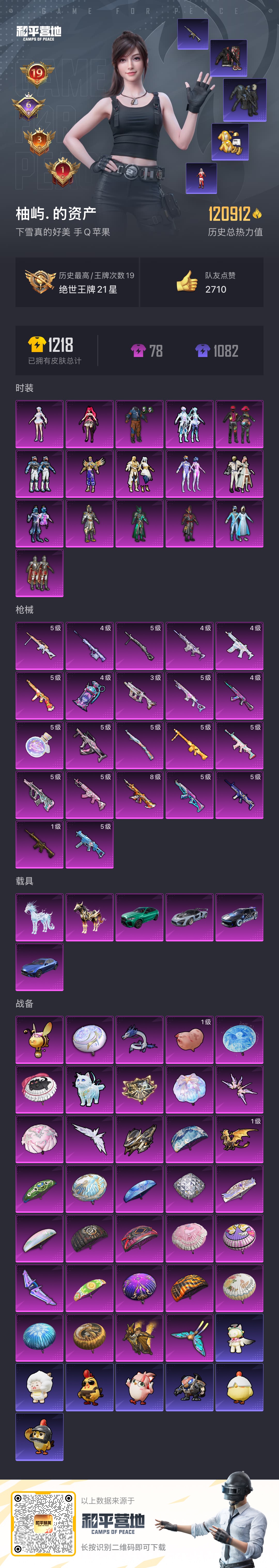 16粉,6载具,233套装,19王牌印记,绝世王牌21星历史最高段,120912热力值 蜜獾-荧海星豚/M416-五爪金龙/AKM-炫紫旋律/SCAR-L-青春物语/SCAR-L-锦绣绵绵/M416-至情至圣/GROZA-镜光银凌/M762-甜蜜誓约/AUG-超新星/AKM-梦之光华/ARX-无垠阁/Mk14-甜梦熊击/MG3-酷泡奶龙/MG-36-沧焰双生/DP-28-豹影疾电/汤姆逊-热量炸弹/Vector-最终圣卫者/UMP45-雪国精灵/破片手榴弹-瓶中星球/烟雾弹-电雾迷城/AMR-鸢尾晶梦/Kar98K-巳巳如意/玛莎拉蒂Ghibli(蓝)/宝马X6 M(曼岛绿)/冰辰御座(神秘蓝)/迈凯伦塞纳(冷萃蓝)/冰绡玉鳞/黑曜夜骑/