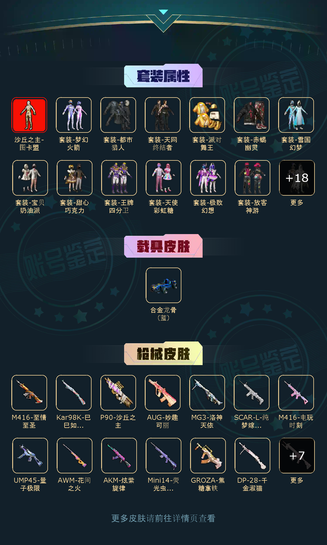 【稀有资产】沙丘之主-图卡盟[3级]/套装-雪国幻梦/套装-派对舞王/套装-深海小丑鱼/套装-赤蝎幽灵/套装-都市猎人/套装-天网终结者/套装-奇异狩猎者/套装-浪漫天命/套装-暗影哥特/套装-龟仙人/角色-都市丽猫/角色-摩登魅猫/套装-狂沙舞者/套装-东方飞龙/套装-冷酷挑战者/M416-星际漫游/M416-黄金龙骨/M416-快乐主宰