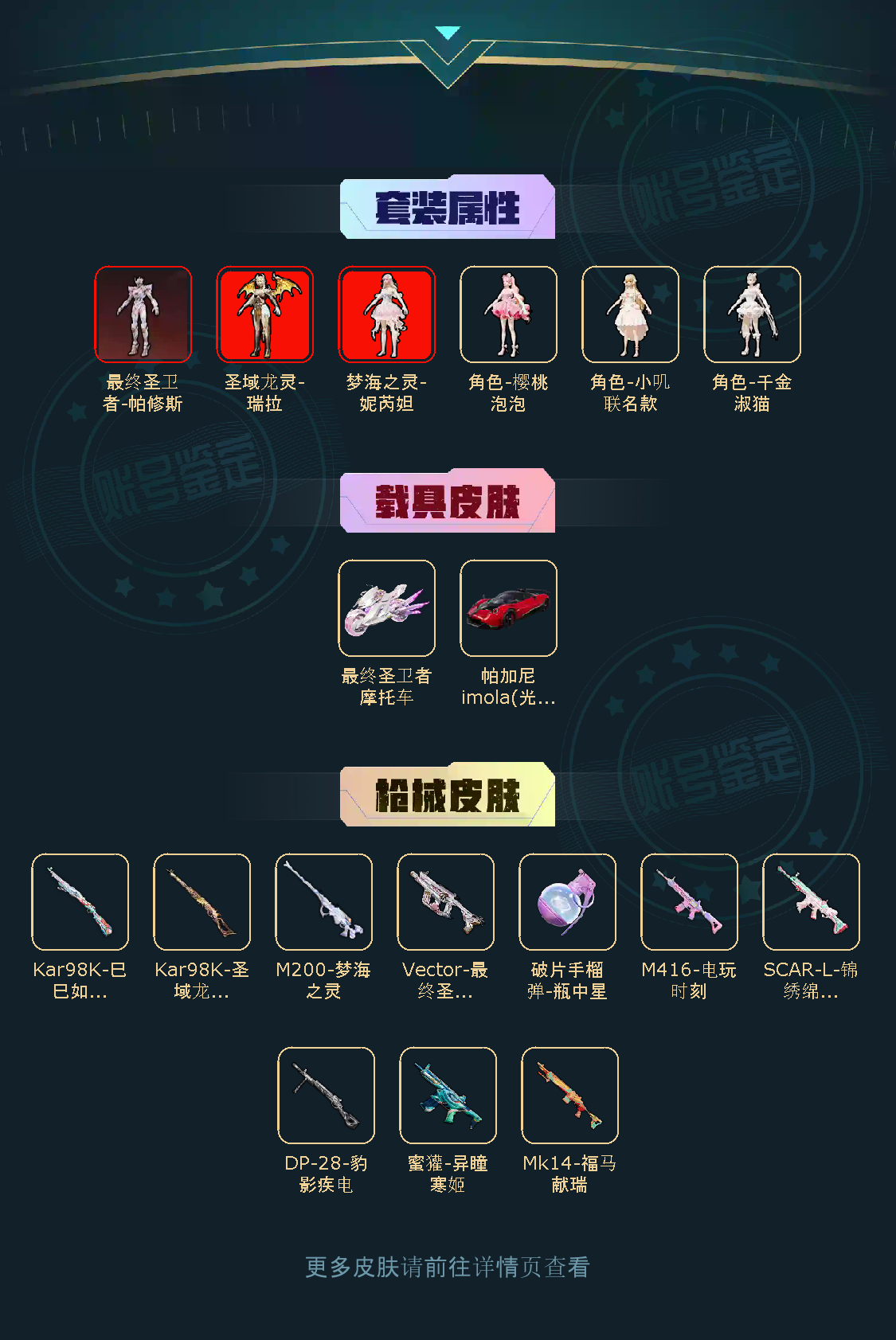 【粉色枪皮】蜜獾-异瞳寒姬/M416-电玩时刻/SCAR-L-锦绣绵绵/Kar98K-圣域龙灵/Kar98K-巳巳如意/M200-梦海之灵/Vector-最终圣卫者/DP-28-豹影疾电/破片手榴弹-瓶中星球