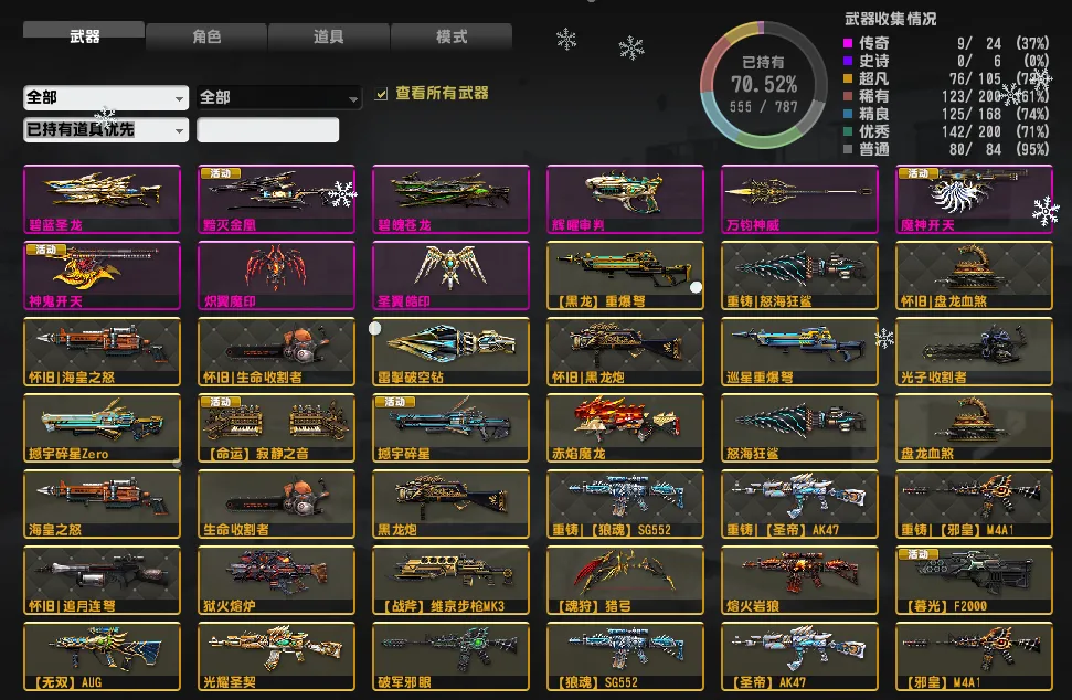 1、2100级拉风青称荣誉、最新闪电机枪、全套怀旧武器全套皮肤、多美女角色、全神、猛虎战旗黑丝娘喷漆、基本全翅膀、神威战翼龙神翅膀、雷文畅、四闪套、维京套,多赛季66配件,十周年,2、极品强化武器,十周年、全红僵尸皮肤、武器全皮肤、刀具俱全、适合玩全模式 3、请您收藏起来、多多好评、不喜勿喷、有需要改善加配件的请您好评留言、谢谢您的支持 4、武器已截图,游戏已去黑雾 ,性价比很高的一个账号,最后祝您愉快游戏