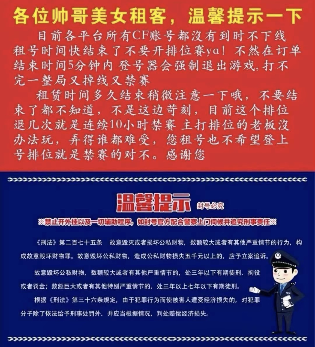 !!!!!!!!!!!!!!!!!!!! 租客必看: 【开科技,发广告,开外挂的租客,本店将起诉至法院索赔,已起诉多名违规租客,法网恢恢疏而不漏!!!】 【订单时间快到了禁止再开排位赛,导致账号禁赛的租客将被永久拉黑!】 !!!!!!!!!!!!!!!!!!!! 一、 有什么问题请填写真实理由【不要无故撤单】否则拉黑,本店将拉黑【恶意撤单/广告外挂】的不文明租客 二、 恶意开挂导致账号封禁者 本店将起诉至法院索赔 三、屏幕实时截图检查不要存在侥幸心理
