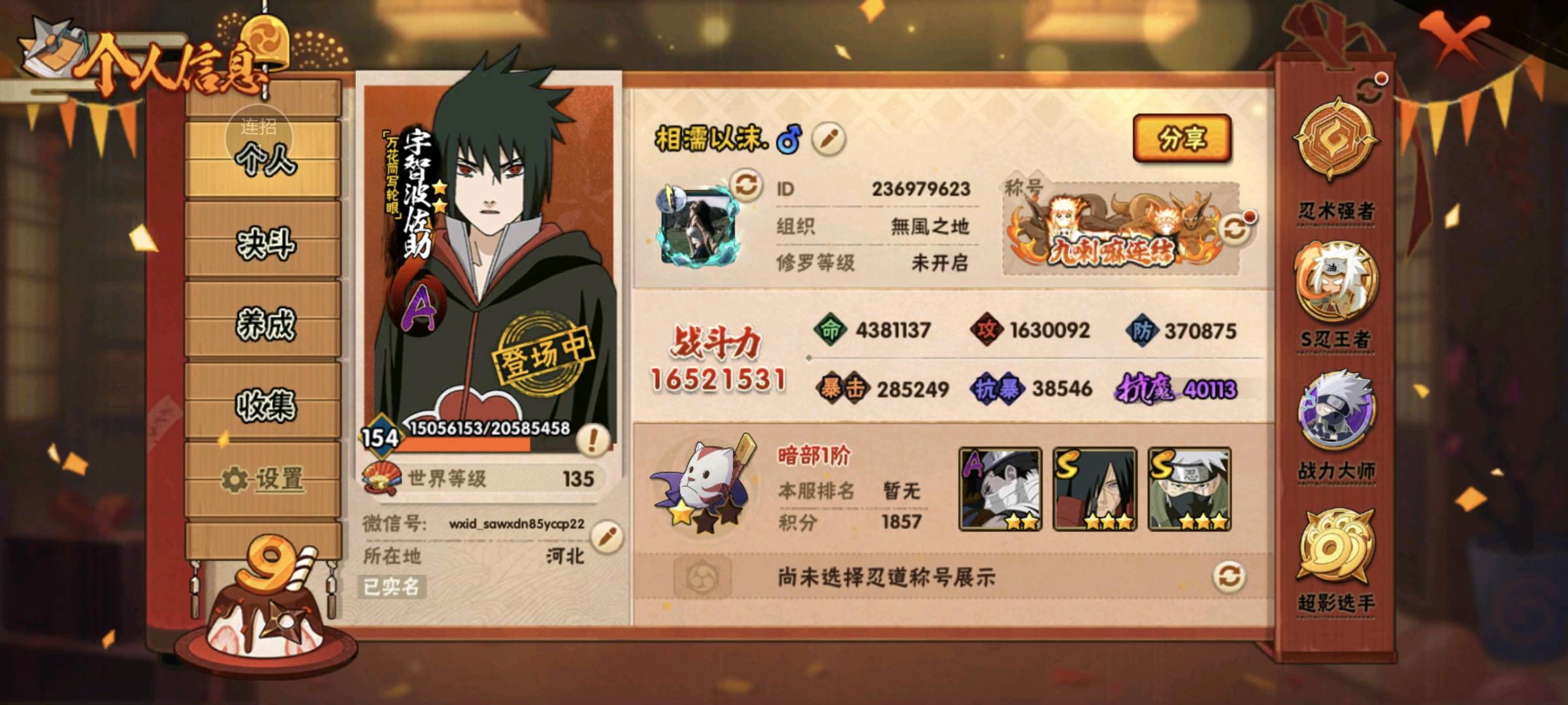 43S 65A 298忍者 1650万战力(五影会谈)斑/