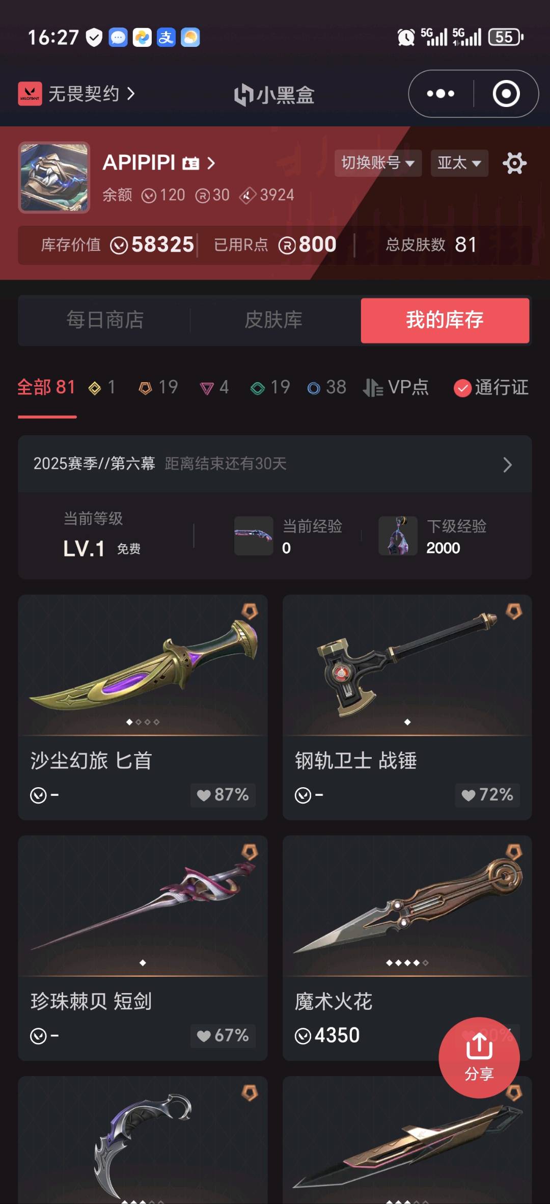 港服,6w库存,刀皮有九把,掠夺爪,电光钳,边陲斧等,枪皮多,有23冠军ak。可匹配排位。禁止开挂