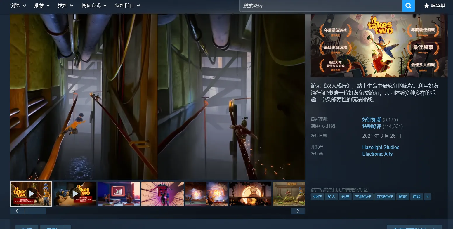 游玩《双人成行》,踏上生命中最疯狂的旅程。利用好友通行证*邀请一位好友免费游玩,共同体验多种多样的乐趣,享受颠覆性的玩法挑战。