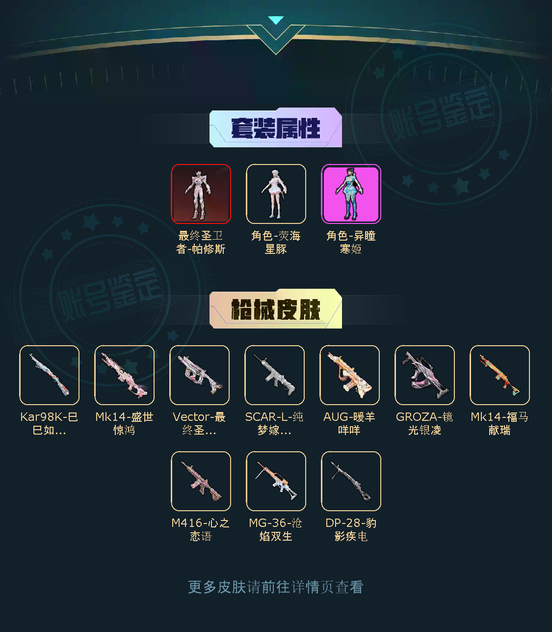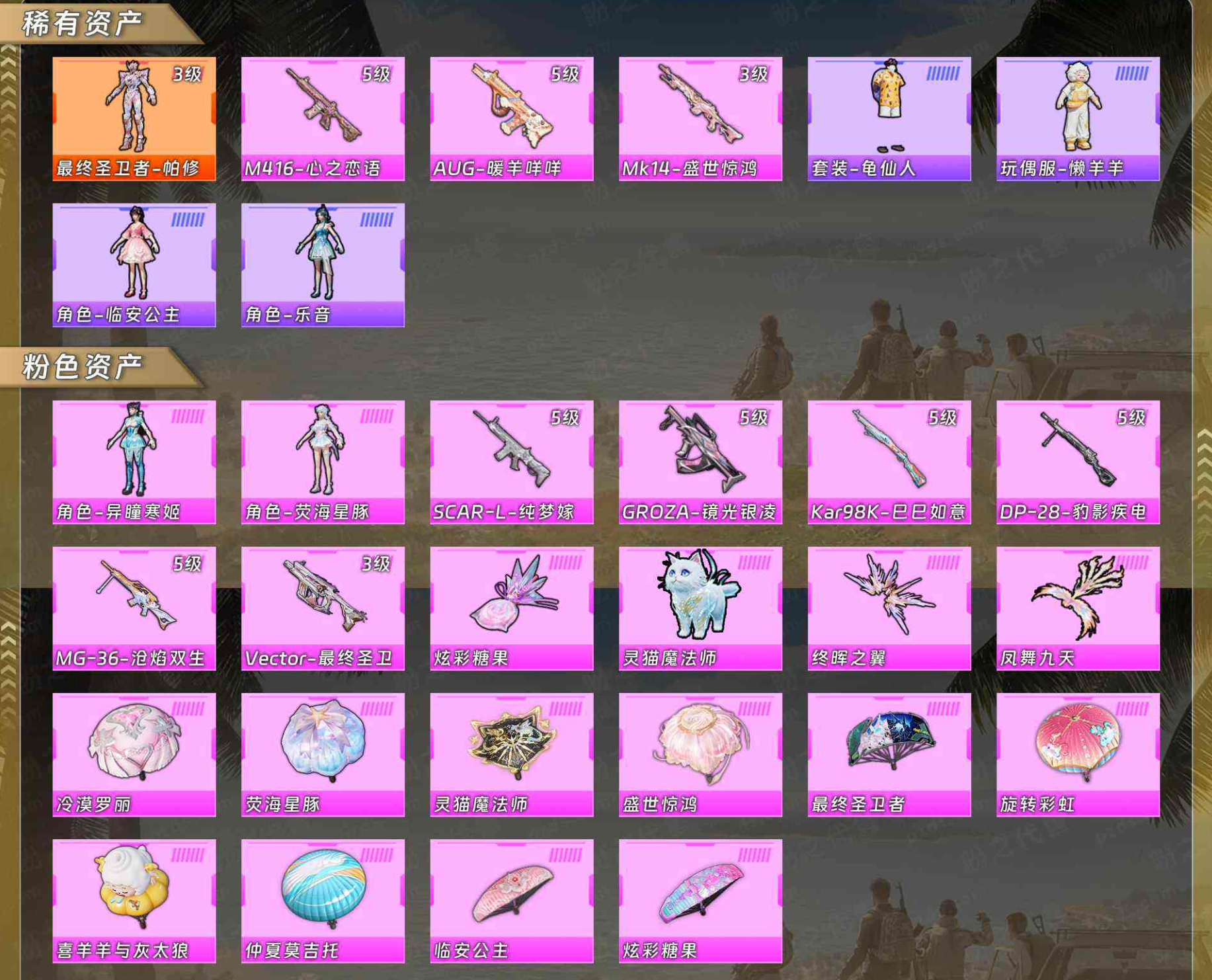 【稀有资产】最终圣卫者-帕修斯[3级]/M416-心之恋语/AUG-暖羊咩咩/Mk14-盛世惊鸿/套装-龟仙人/玩偶服-懒羊羊/角色-临安公主/角色-乐音