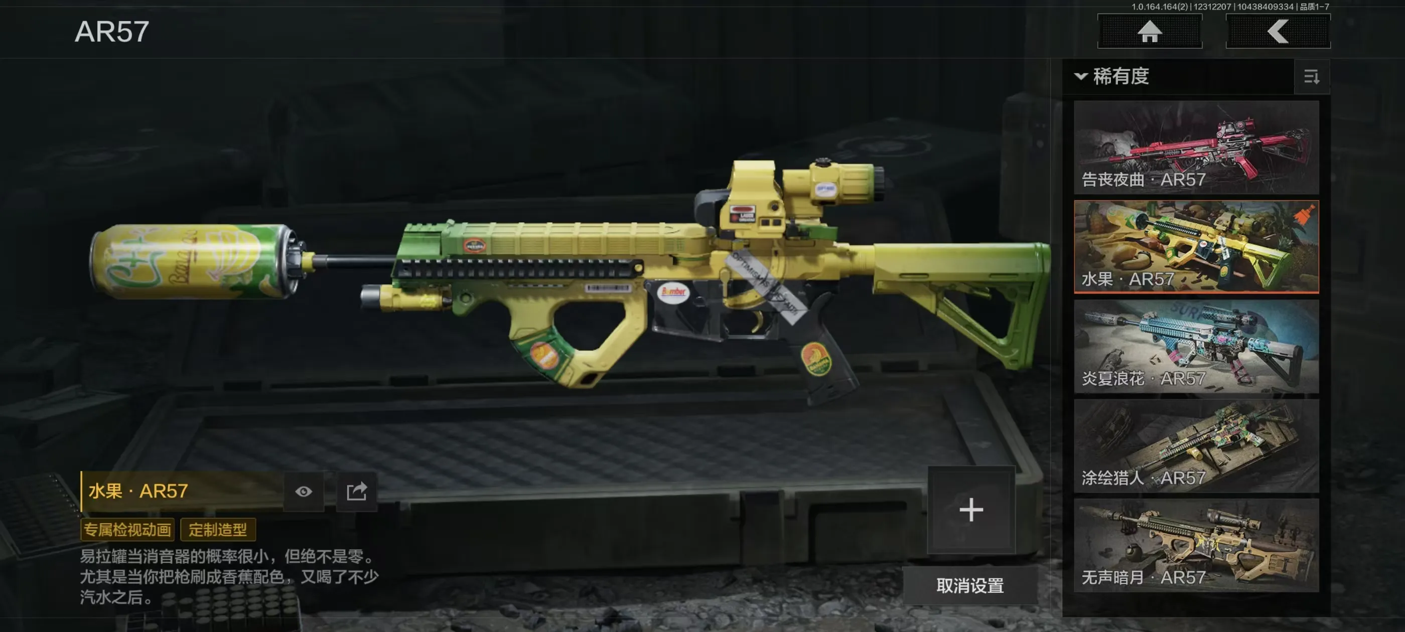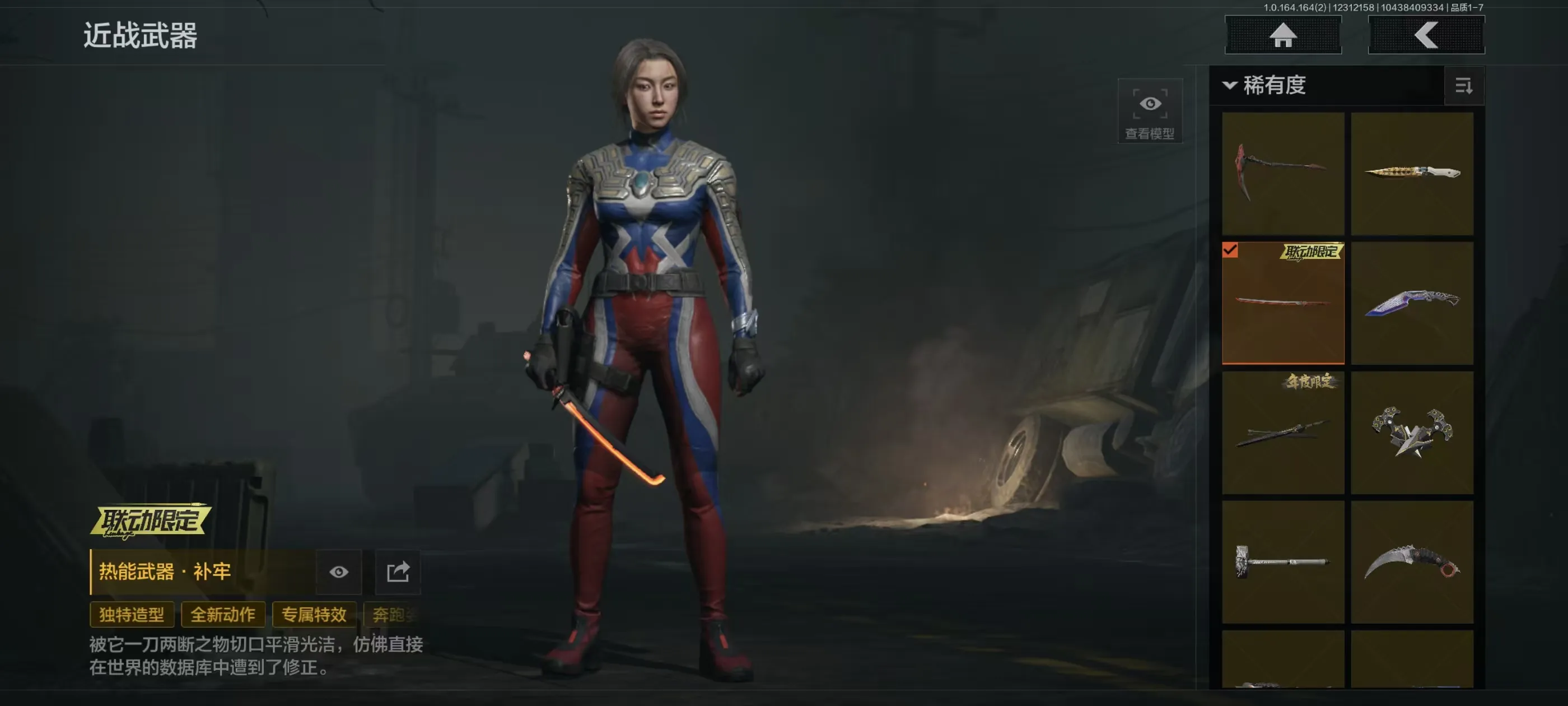 刀皮15,金枪皮20,近战武器:精英指虎,冬日冰镐,龙魂双节棍,明刀绣春,涂鸦利刃,胜利军刀,贝利亚黄昏,下弦月,旧日主宰,寒牙手刺,三尺万仞战术剑,瀚星斩铁,热能武器补牢,赢家匕首,收割者;手套:噤声者作战手套,玉鸾挂枝手套,战术甲胄防护手套;角色套装:使徒欧瑞恩,火绒塔莉娅,危崖魅影作战服,都护铁衣战术甲胄,黑暗行者特摄戏服,正义战士特摄戏服,噤声者吉利服,钢铁壁垒作战服,不败坚守作战服,龙魂武术运动服,战术甲胄,万众狂欢套装,枪皮:午夜梦魇FAL,诸星之子FAL,战术大师FAL,蓝色咆哮H416,堕落者H416,竞技H416,告丧夜曲AUG,水果AR57,告丧夜曲AR57,旗帜AEK,银月AN94,冬夜AK12,钢铁真理QBZ191,浮鳞影青QBZ192,利齿风暴MPX ,骑士之剑VSS,冰河碎影MK14,棱光裂变QBU191,长缨风掣RPK16;