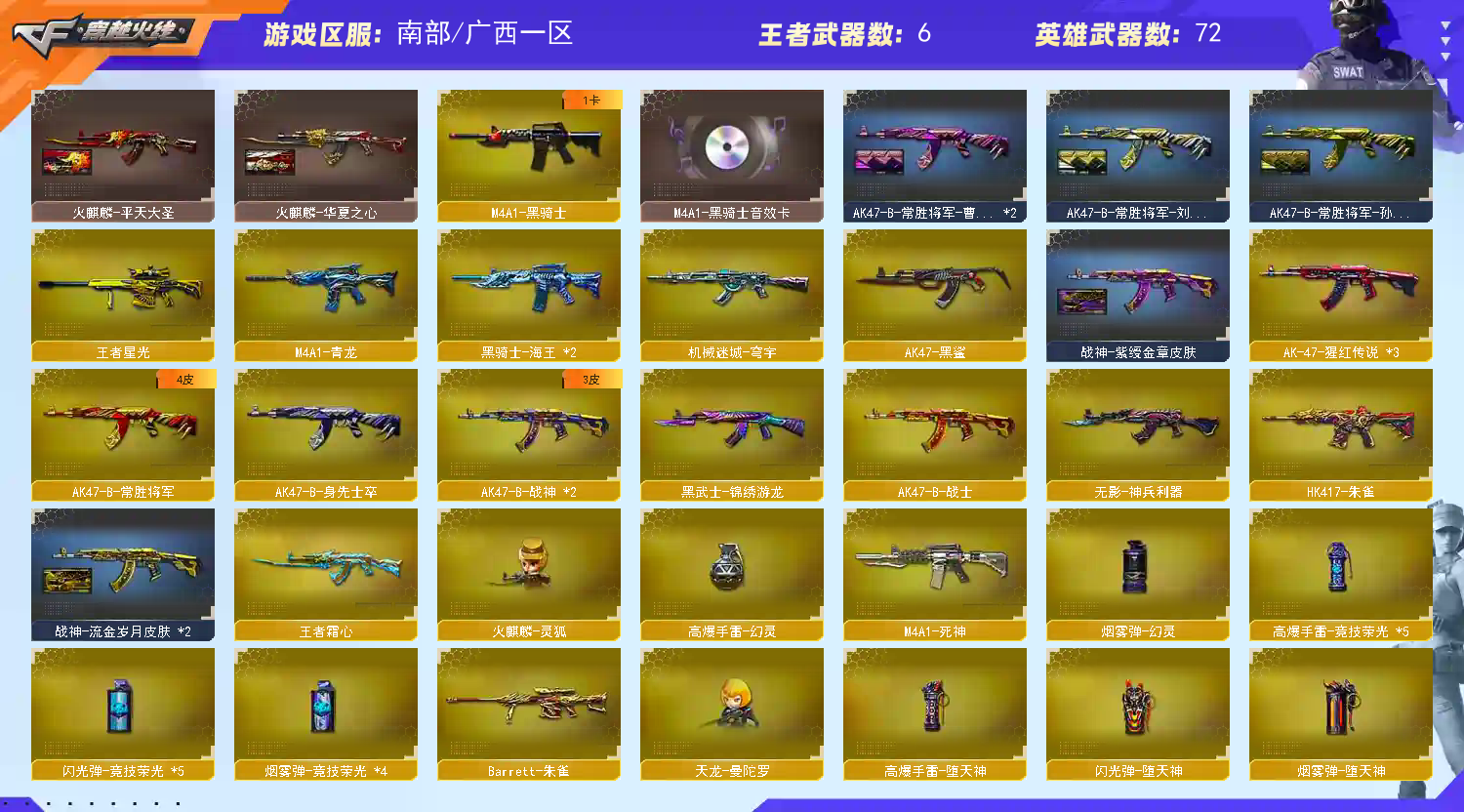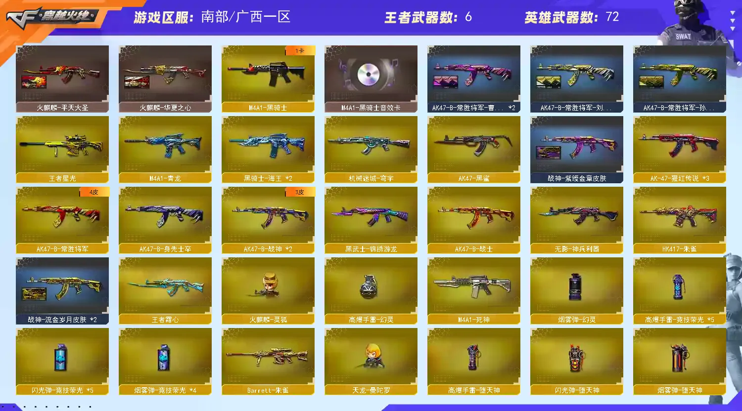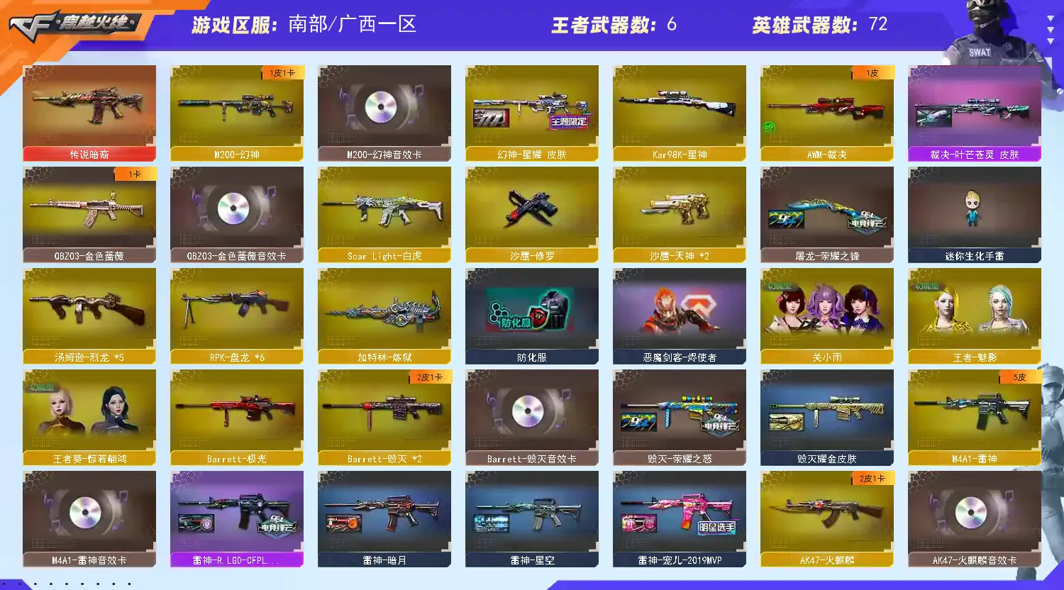 【亮点解析 幻神三件套 黄金猫猫手套白鲨】【M200-幻神+音效卡+幻神-星耀】【Kar98K-星神】【传说暗裔】【ScarLight-白虎】【QBZ03-金色蔷薇+音效卡】【生化 6盘龙 炼狱 5烈龙】【裁决+叶芒苍灵】【毁灭+音效卡+毁灭-荣耀之怒】【极光】【火麒麟+音效卡】【雷神+音效卡+雷神-lgd18冠军+雷神-宠儿】【黑骑士+音效卡】【王者之心 王者炎心 王者之烈 王者星光】【死神 黑鲨 青龙 hk417-朱雀】【3手枪 修罗 天神*2】【9近战 屠龙*2 擎天*2 麒麟刺 王者之击】【手雷 堕天神 竞技荣光*4】【四防 王者魅影 王者葵惊若翩鸿 职业经理】