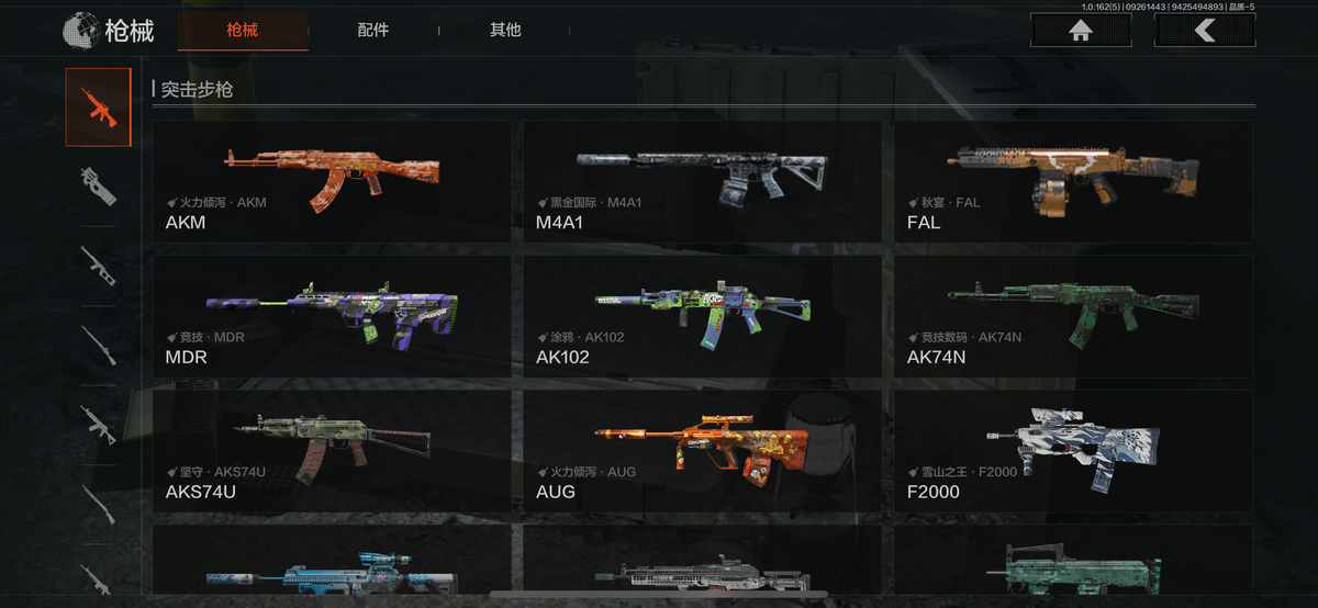 30级,历史最高段位:暗区传说【近战武器】:赢家匕首,涂鸦利刃,来战开山刀,工兵铲;【角色皮肤】:都市夜影套装,林地作战服;【突击步枪】:火力倾泻AKM,历战AKM,黑金国际M4A1,竞技FAL,和平之手FAL,秋宴FAL,竞技MDR,鱼跃丹青AK102,涂鸦AK102,来战AK74N,山地伪装AKS74U,竞技数码AK74N,坚守AKS74U,火力倾泻AUG,赢家F2000,钢铁真理F2000,雪山之王F2000,炎夏浪花AR57,旗帜AEK,绿松石数码Groza,四色花SCARL,绿松石数码T951,森林迷彩T03,利齿风暴T03,沙漠数码T03,北国内卫AK12,战术大师QBZ192,鱼绿松石数码9A91;【冲锋枪】:火力倾泻MP5,森林迷彩MP5,涂鸦MPX,利齿风暴MPX,青瓷涂层MPX,苏梅克UMP45,荒漠涂绘T79,神锋Vector45,绿松石数码T85,都市黄Vector9,山地伪装Vector9,青瓷涂层MP5K;【射手步枪】:旗帜SVDS,雪原凌锋SVDS,危险地带VSS,绿松石数码DBR,绿松石数码QBU191;【栓动步枪】滑雪季莫辛,噤声者莫辛,绿松石数码SJ16,滑雪季M24;【轻机枪】:旗帜RPK16;【霰弹枪】:黑金国际M870,危险猎手MP133,营房暖冬USAS12,四色花DP12;【卡宾枪】:绿松石数码SKS,异彩合金M14,滑雪季BM59;【手枪】:碳黑M9A3,雪山之王G18C,涂鸦G18C,赢家G18C,绿松石数码沙漠之鹰,青瓷涂层T05,水蓝F57手枪,深潜F57,碳黑M300;