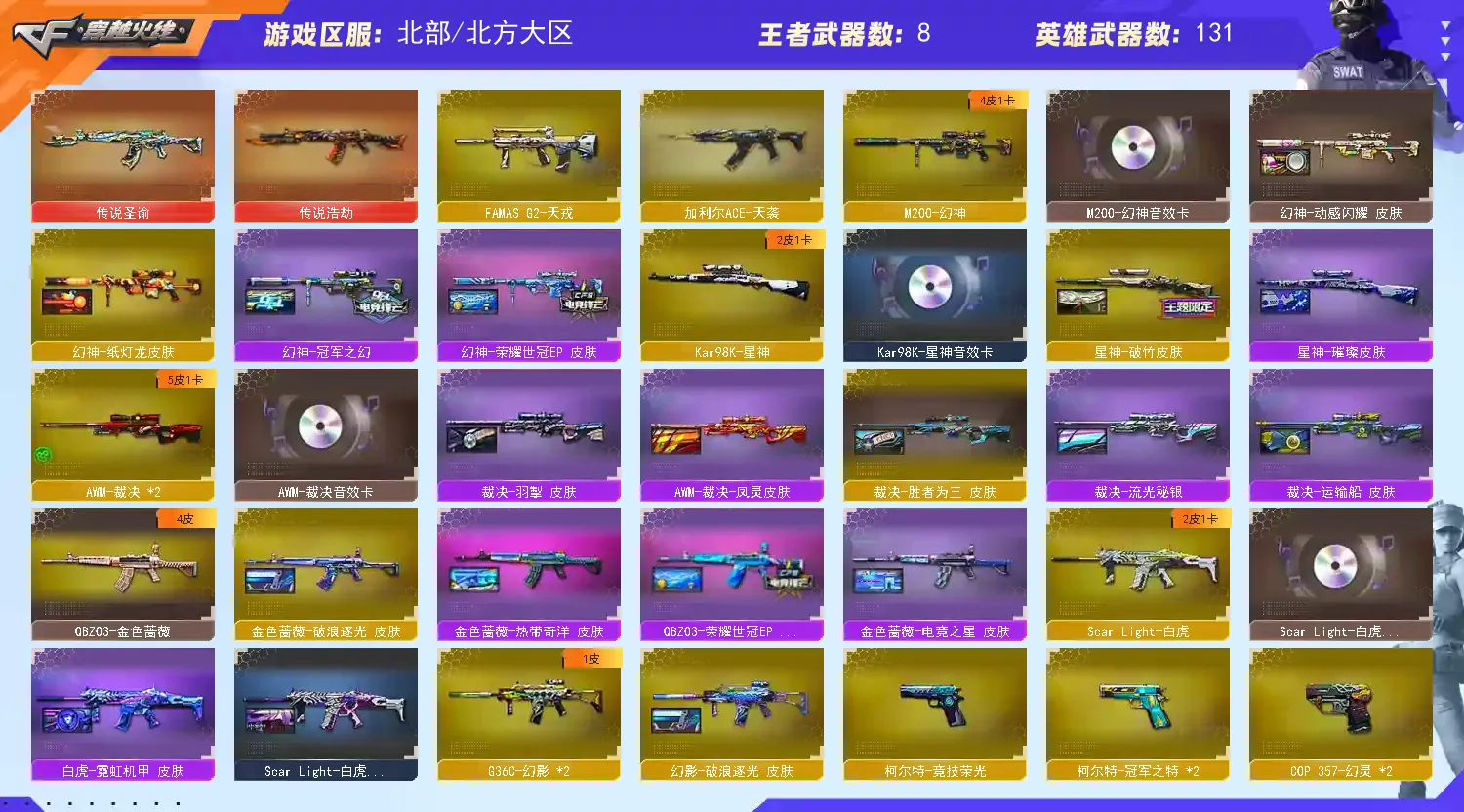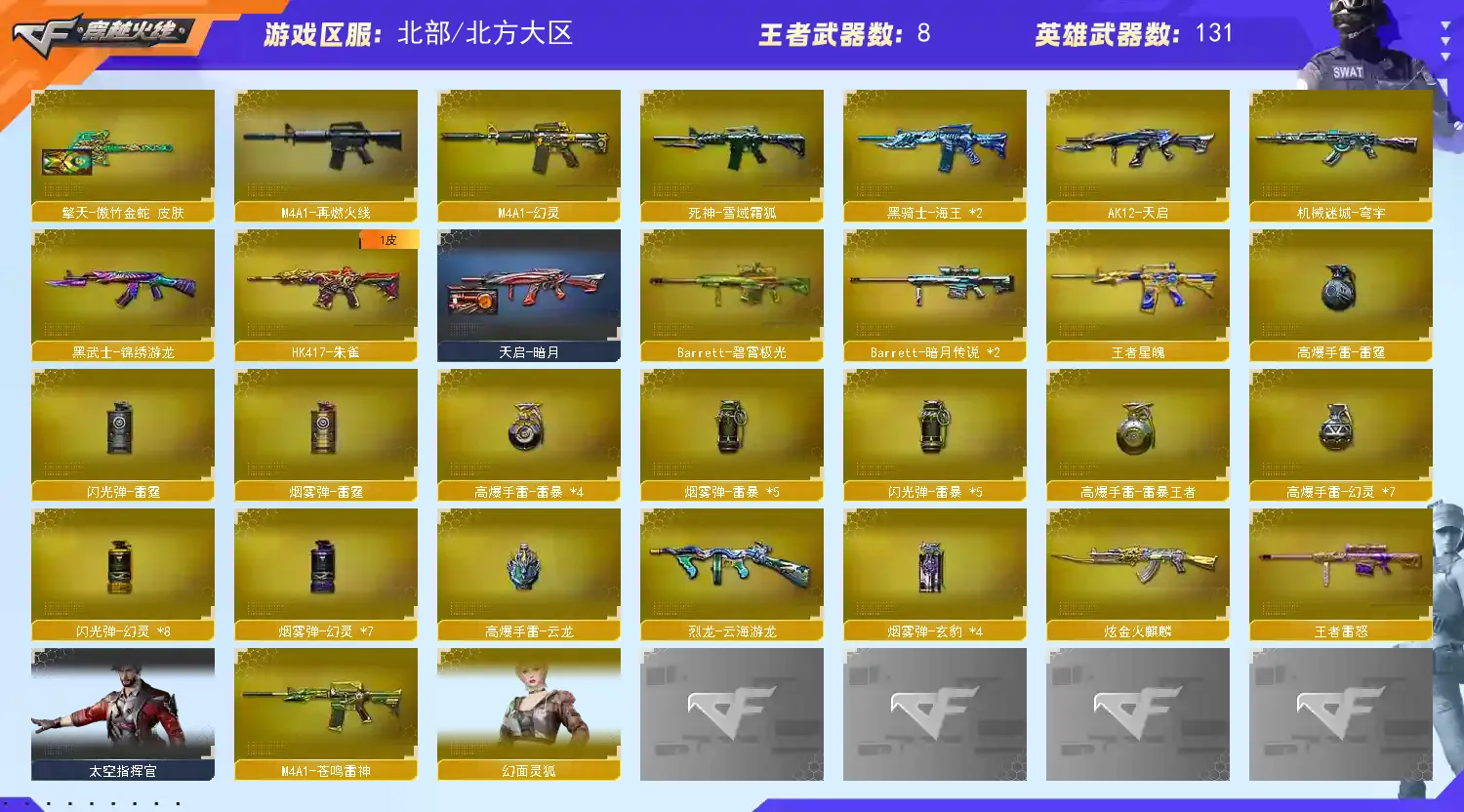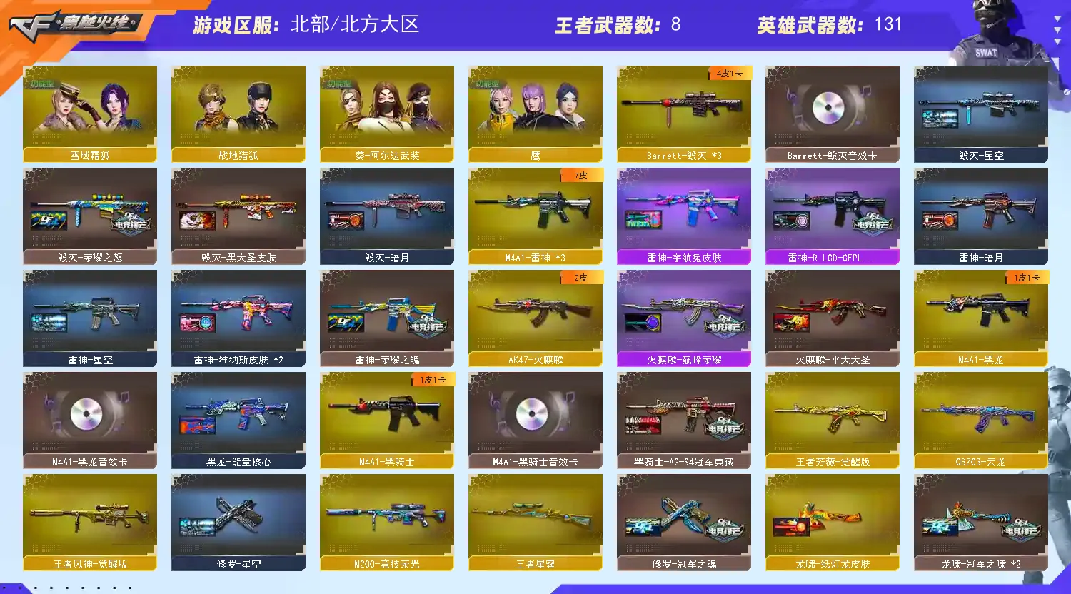 【稀有武器】:M200-幻神/Kar98K-星神/VSK-94-金蚀/G36C-幻影/ScarLight-白虎/HK417-朱雀/M4A1-幻灵/USP-雷暴/COP357-幻灵(2)/柯尔特-竞技荣光/修罗-云海游龙/修罗-古蛇迷踪/柯尔特-冠军之特(2)/金色蔷薇-古蛇迷踪/QBZ03-云龙/QBZ03-金色蔷薇/AK47-火麒麟/M4A1-黑龙/M4A1-雷神(2)/M4A1-黑骑士/Barrett-毁灭(2)/AWM-裁决/M200-竞技荣光/RPK-盘龙/加特林-炼狱(3)/AA-12-雷霆/炽芒蝶刃/斩神刀-雷暴/幻灵之锋