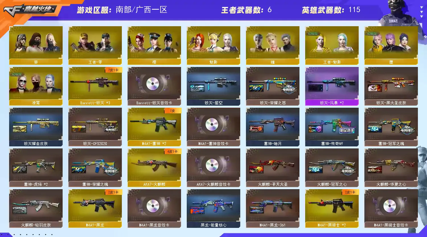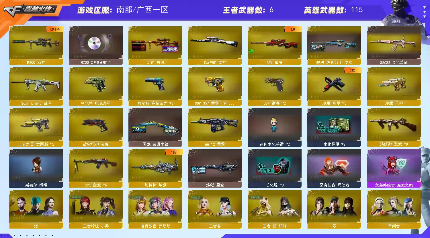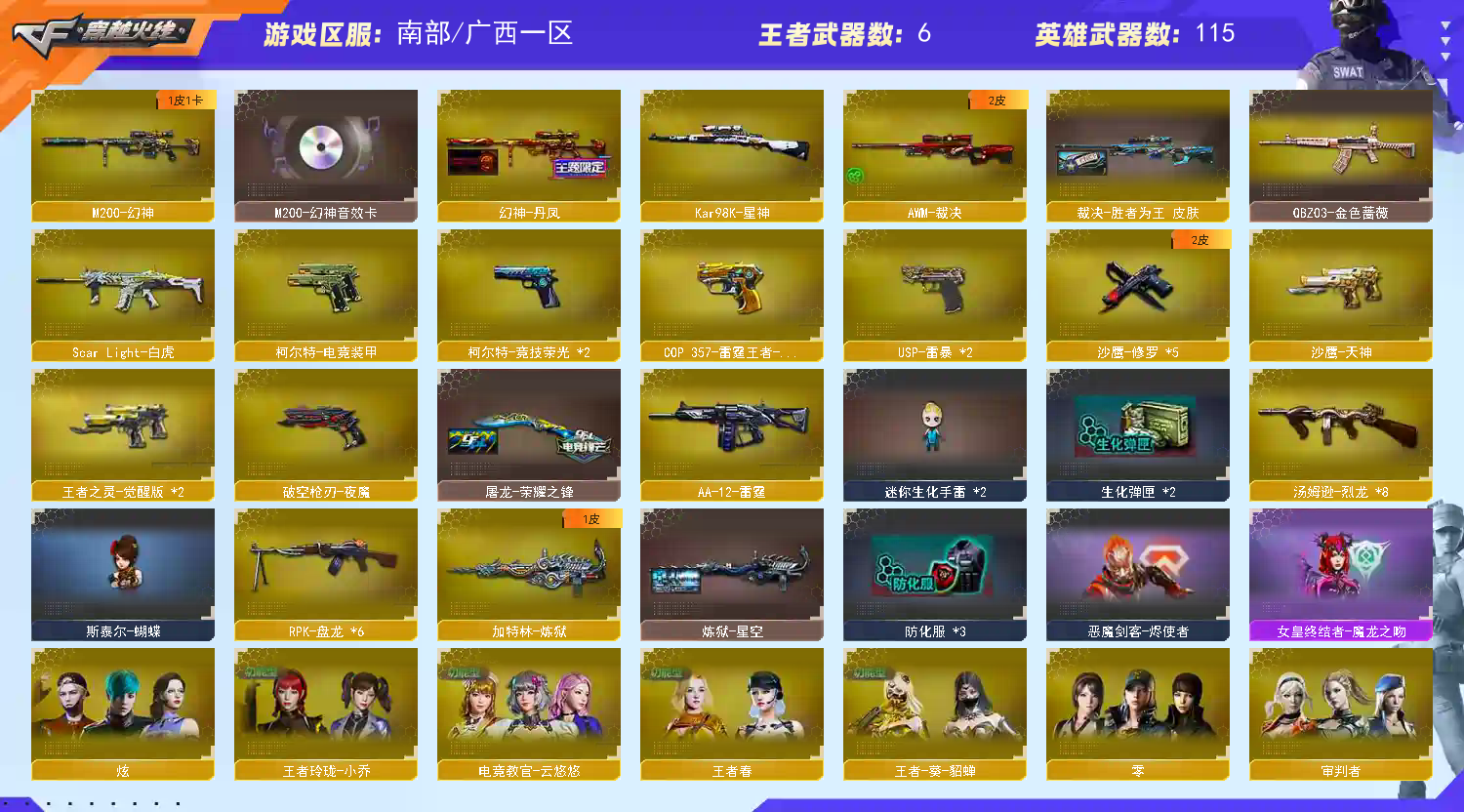 【亮点解析 幻神三件套 生化高配 】【m200幻神+音效卡+丹凤】【98k星神】【m200竞技荣光 +usp雷暴*2+云悠悠】【6盘龙 炼狱 6烈龙 斯太尔蝴蝶 】【scar白虎】【qbz金色蔷薇】【火麒麟+卡+冠军之心 】【黑龙+卡】【雷神+卡+n9皮肤+冠军之魄+荣耀之魄】【黑骑士+卡】【毁灭+卡 +sv16冠军+荣耀之怒】【裁决 】【夜魔套 】 【武器:武圣 夜魔 王者冰魄 海王 天龙 】 【15手呛:修罗*4 天神 武圣 雷暴*2 夜魔 竞技荣光 王者之灵*2 雷霆王者 】 【15刀具:屠龙*4 龙啸*2 擎天 麒麟刺*4 斩神刀雷暴 夜魔 王者之击 王者之啸 】 【11雷套:雷暴雷*4 夜魔雷*7 】 【小人呛: 火麒麟灵狐 火麒麟绝迹 】 【音效卡:毁灭音效卡 雷神音效卡 火麒麟音效卡 黑龙音效卡 幻神音效卡 黑骑士音效卡 】 【四防角色:凌霄 王者春 王者葵貂蝉 王者魅影 王者玲珑小乔 】