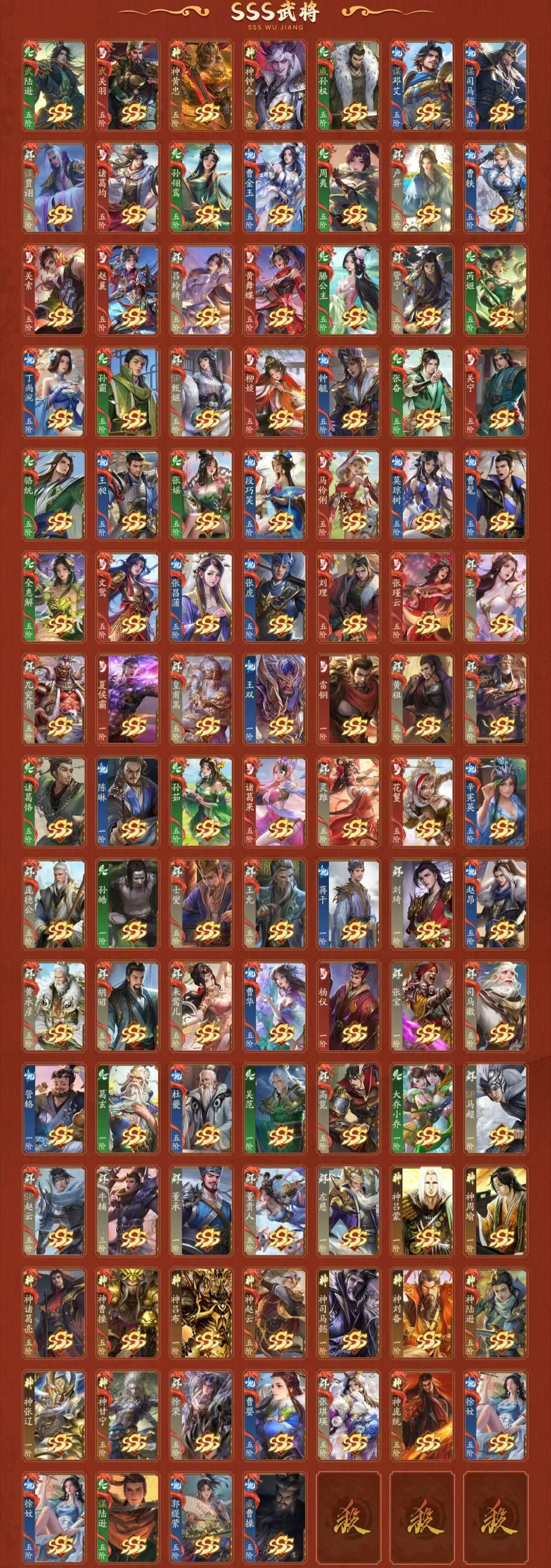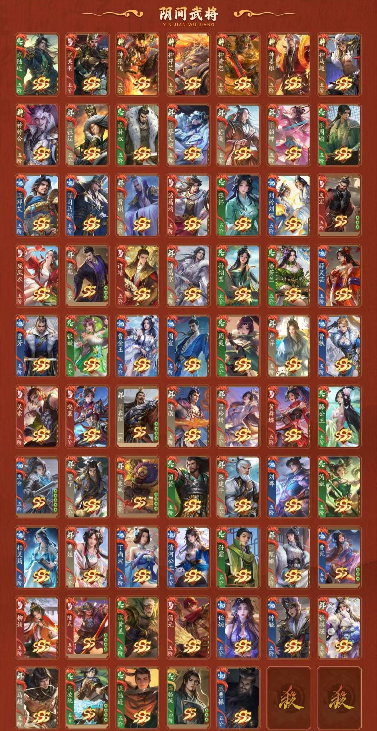 阴间将:武陆逊/武关羽/神张飞/神邓艾/神黄忠/神姜维/神马超/神钟会/威张辽/威孙权/乐蔡文姬/乐祢衡/乐貂蝉/乐周瑜/谋邓艾/谋司马懿/谋贾诩/诸葛均/张怀/刘衿刘佩/庞宏/庞凤衣/袁胤/许靖/诸葛京/孙翎鸾/藤芳兰/薛灵**/曹芳/张嫙/曹金玉/周宣/周夷/卢弈/曹轶/关索/赵襄/星袁绍/许劭/吕玲绮/黄舞蝶/藤公主/庞会/管宁/张曼成/留赞/朱建平/刘晔/芮姬/柏灵筠/曹媛/丁尚涴/清河公主/孙霸/SP甄姬/曹宪/柳婒/陈式/谋黄盖/蒲元/任婉/钟毓/张琪瑛/威马超/界凌统/谋陆逊/谋骆统/威曹操