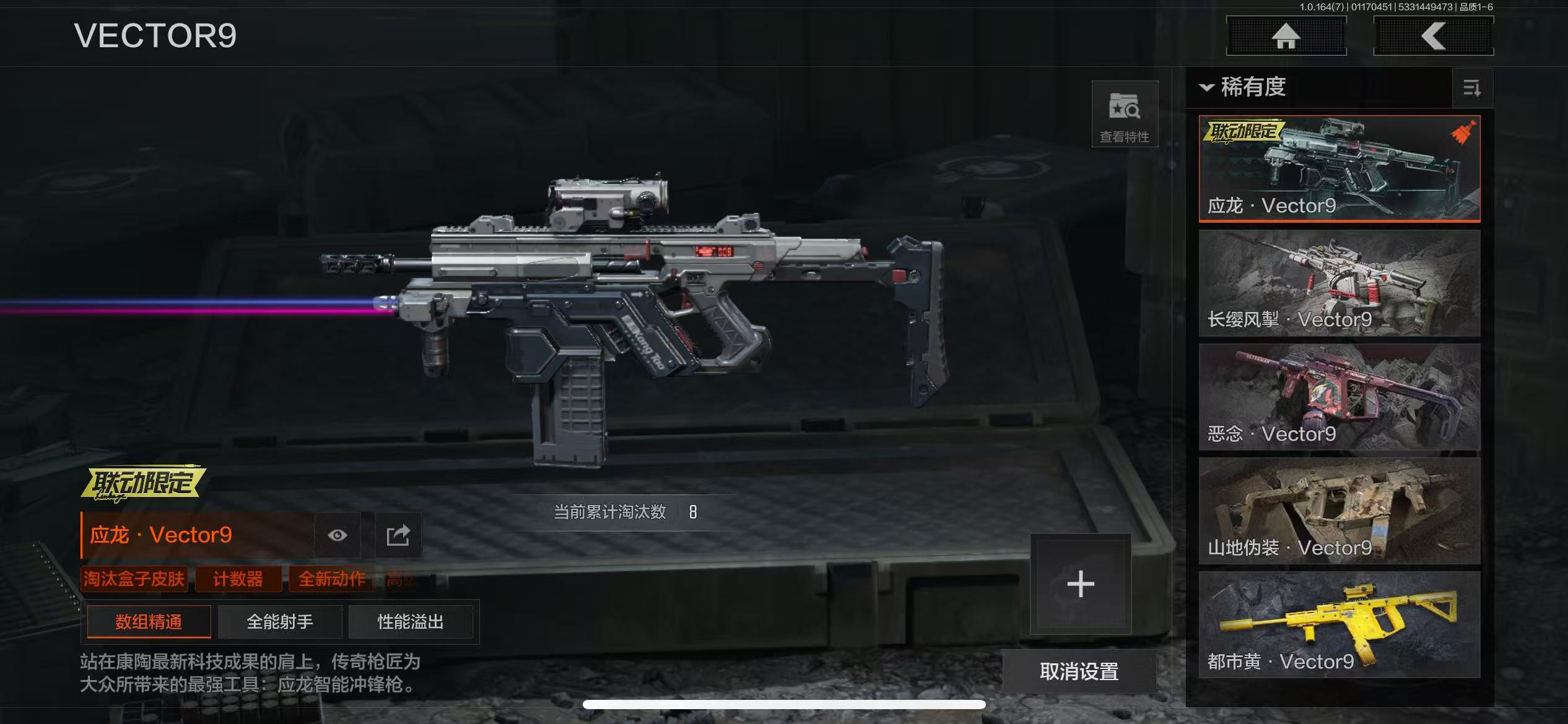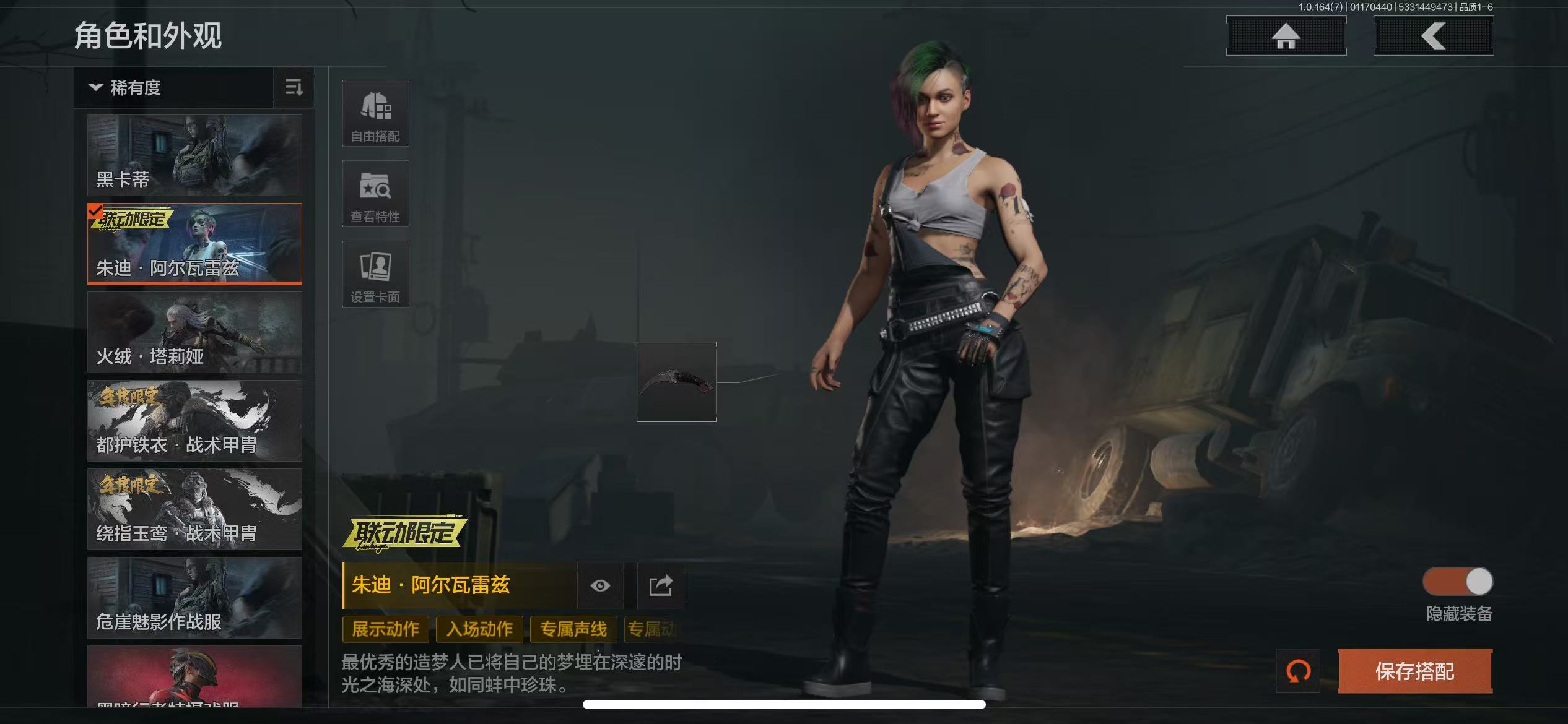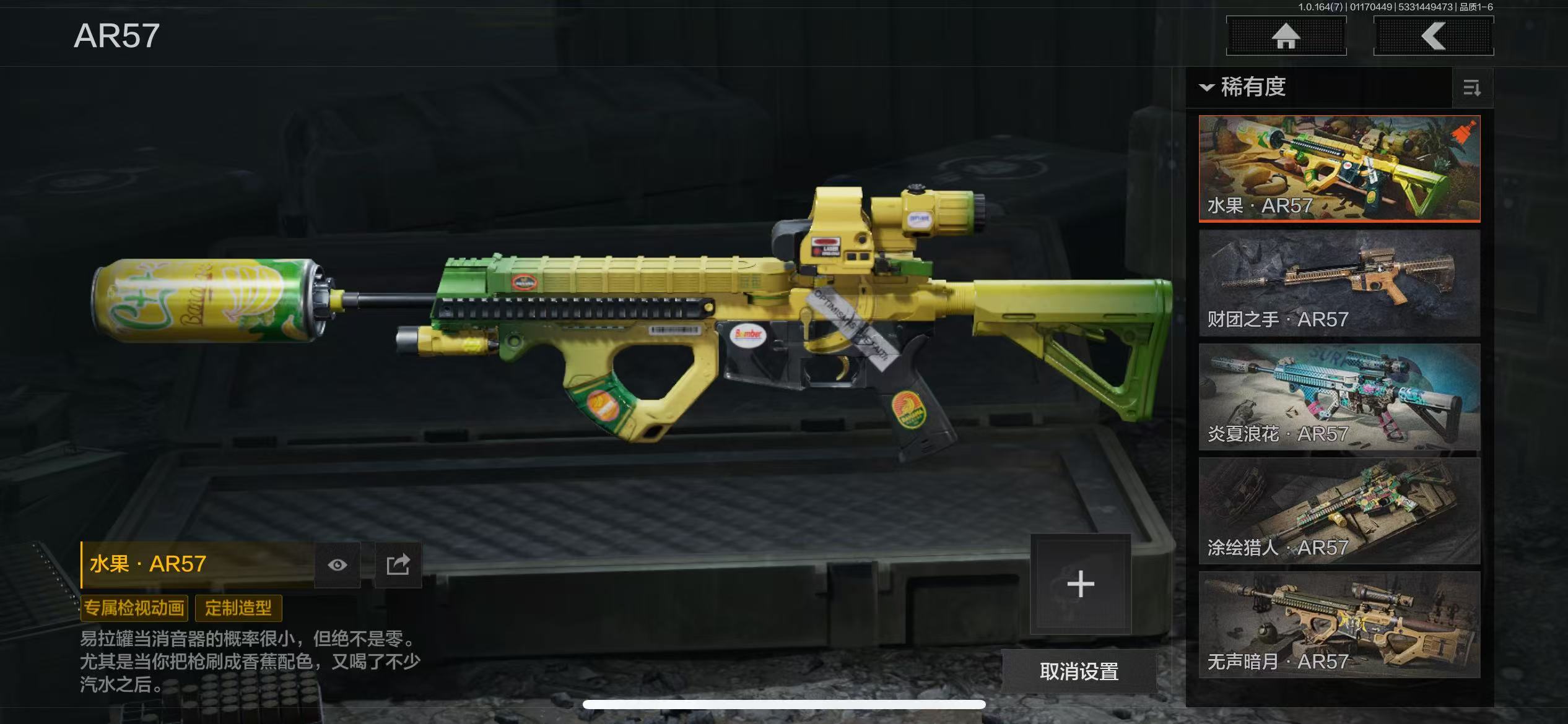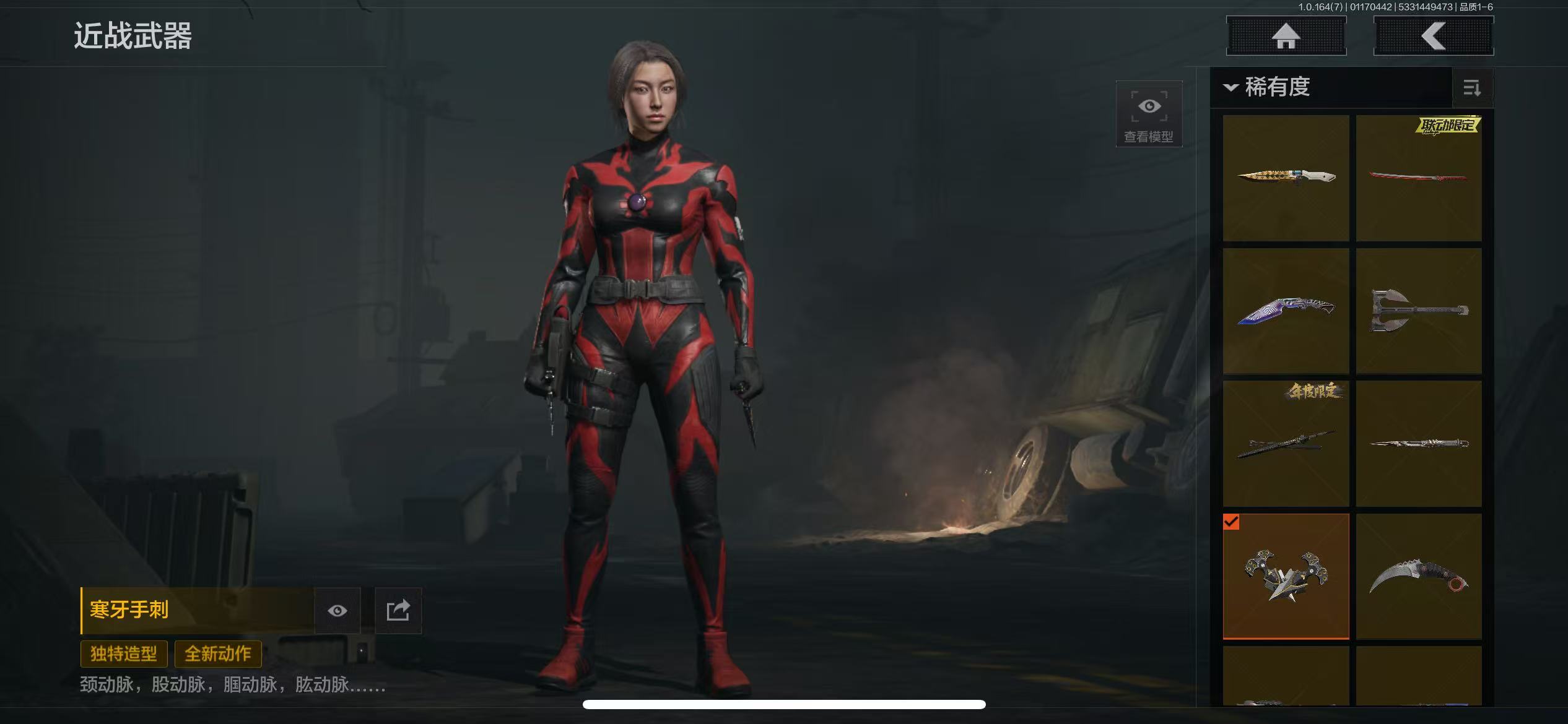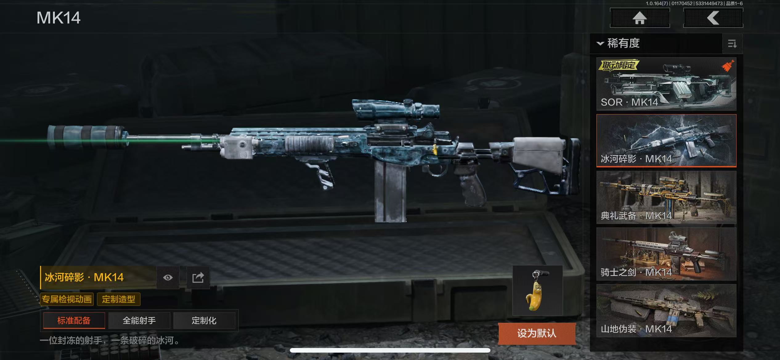 17刀皮,近战武器:涂鸦利刃,明刀绣春,急袭弯刀,胜利军刀,下弦月,冬日冰镐,三尺万仞战术剑,精英指虎,贝利亚黄昏,寒牙手刺,盘牙彻甲短刃,瀚星斩铁,不屈烈怒,来战开山刀,工兵铲,赢家匕首,热能武器补牢;手套:冬日手套,玉鸾挂枝手套,噤声者作战手套;角色套装:火绒塔莉娅,绅士西服,朱迪阿尔瓦雷兹,黑暗行者特摄戏服,都护铁衣战术甲胄,绕指玉鸾战术甲胄,钢铁壁垒作战服,噤声者吉利服,战术甲胄,危崖魅影作战服,不败坚守作战服,矿山霸主常服,枪皮:午夜梦魇FAL,战术大师FAL,竞技FAL,堕落者H416,黄金H416,伦琴幻影H416,水果AR57,黄金M4A1,骑士之剑M4A1,黄金FAL,旗帜AEK,钢铁真理QBZ191,骑士之剑VSS,战术大师VSS,冰河碎影MK14,长缨风掣AX50,长缨风掣Vector9,长缨风掣RPK16,骑士之剑MK14