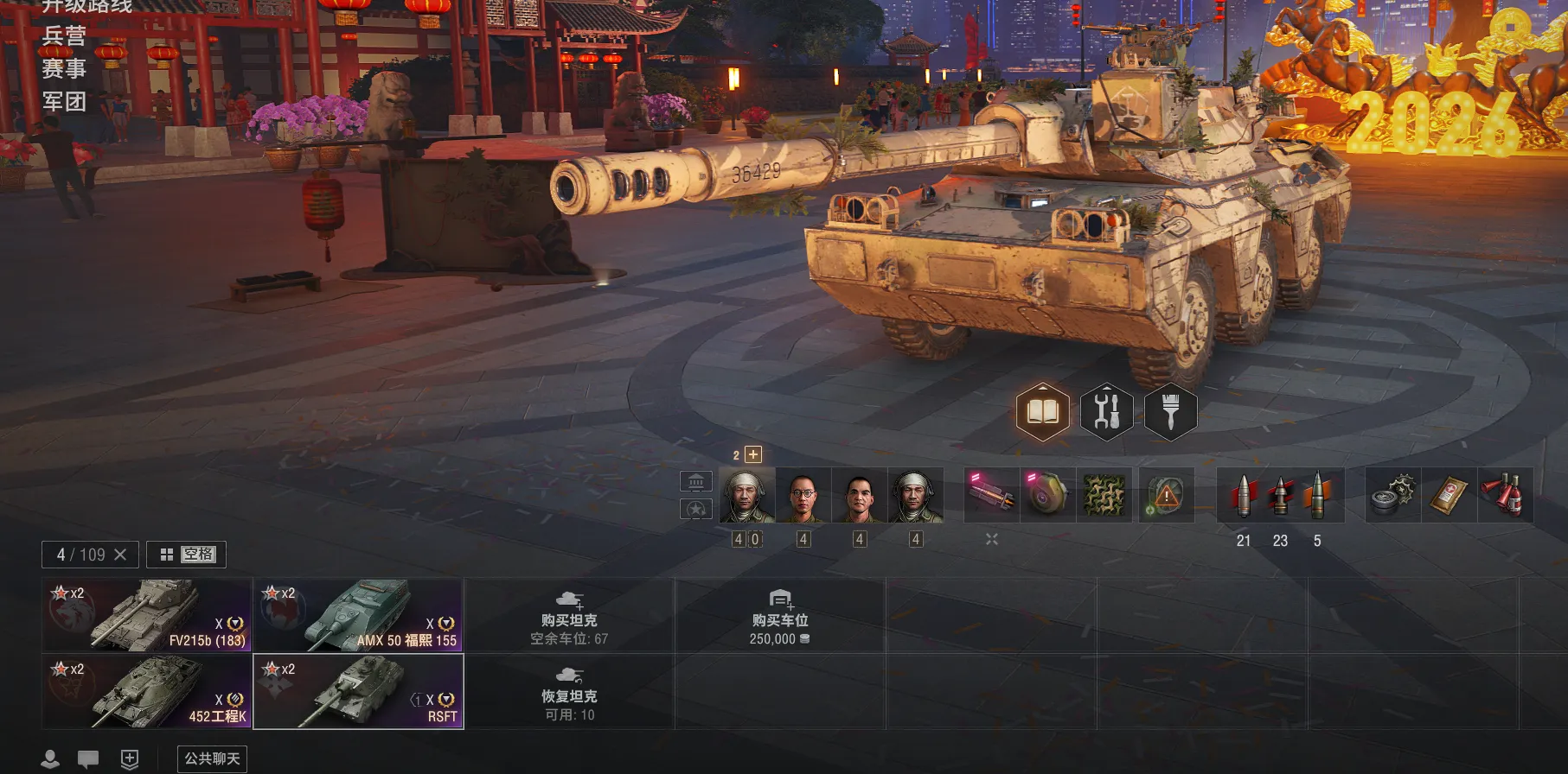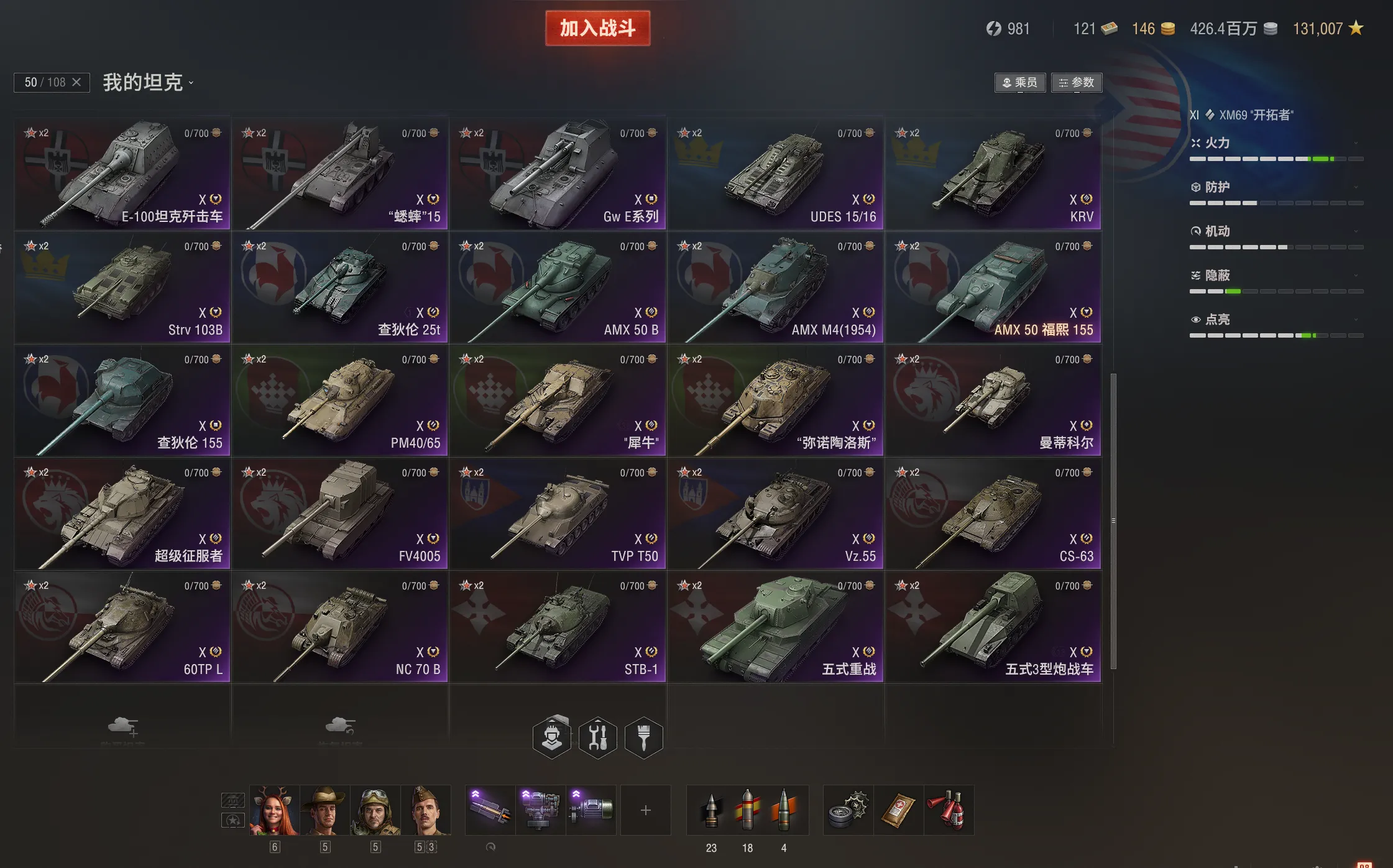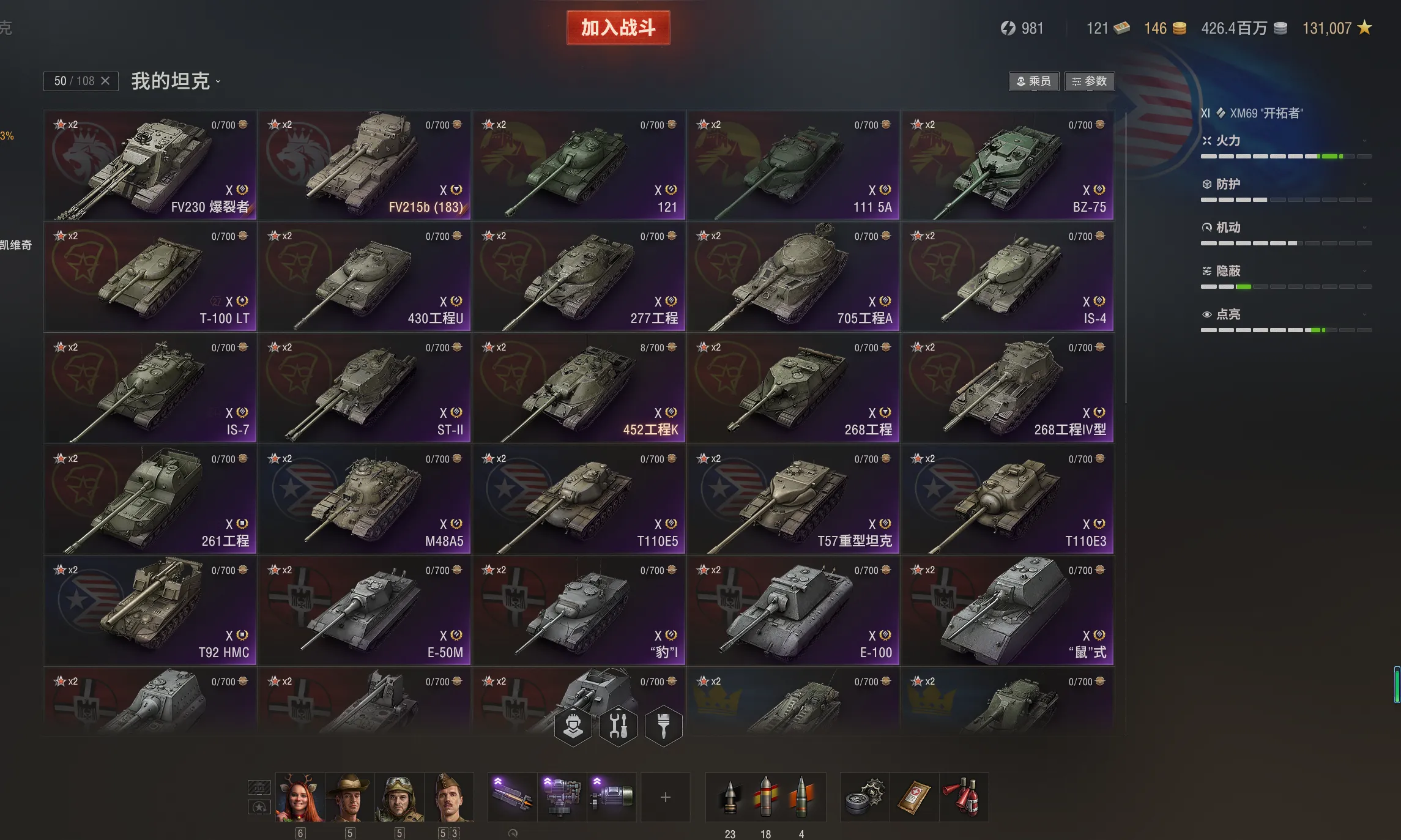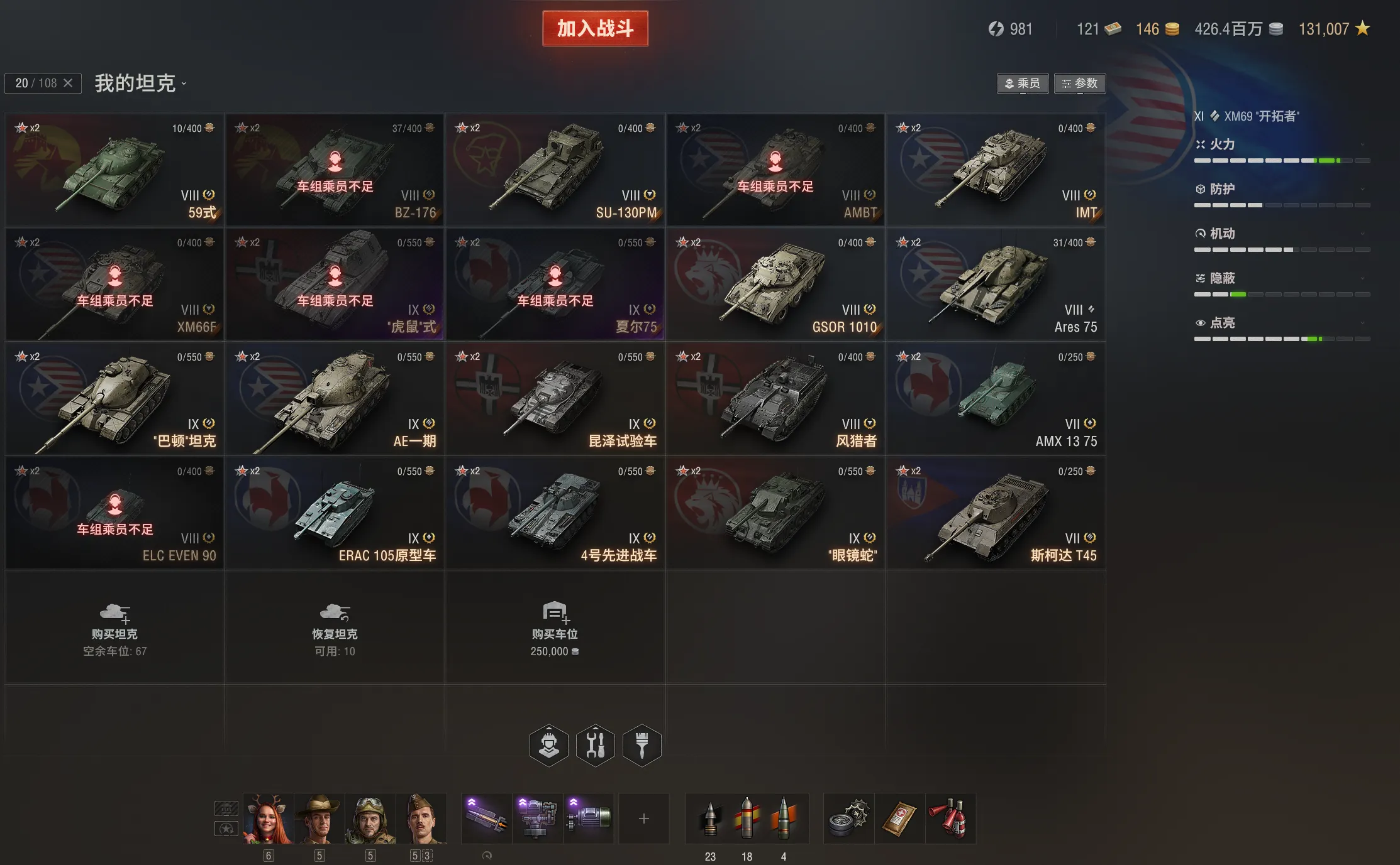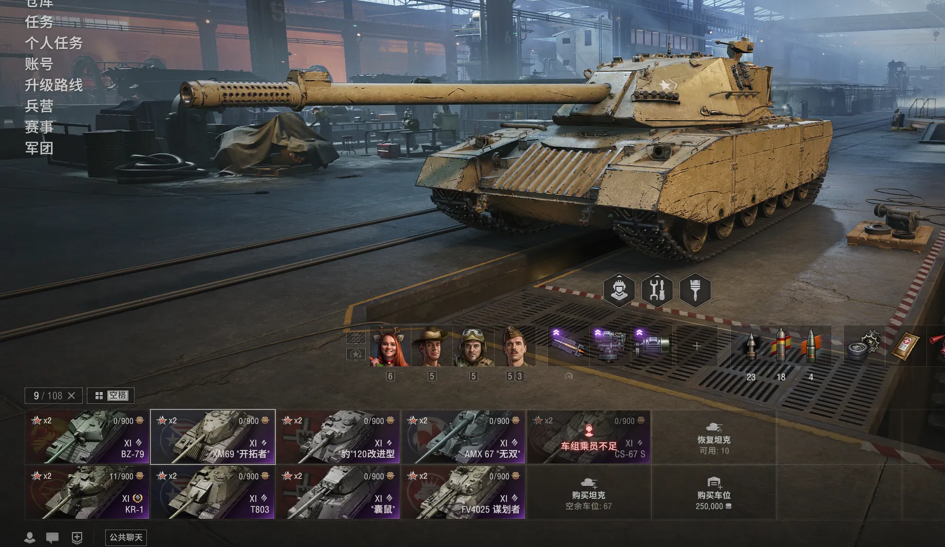 注意事项:1,进入游戏后,如果车辆情况不符。那是因为前面的玩家筛选了自己玩的坦克,其他的隐藏了。坦克显示栏,左下角小坦克标志,点进去把所有系别和级别选上,坦克就全部出来了。