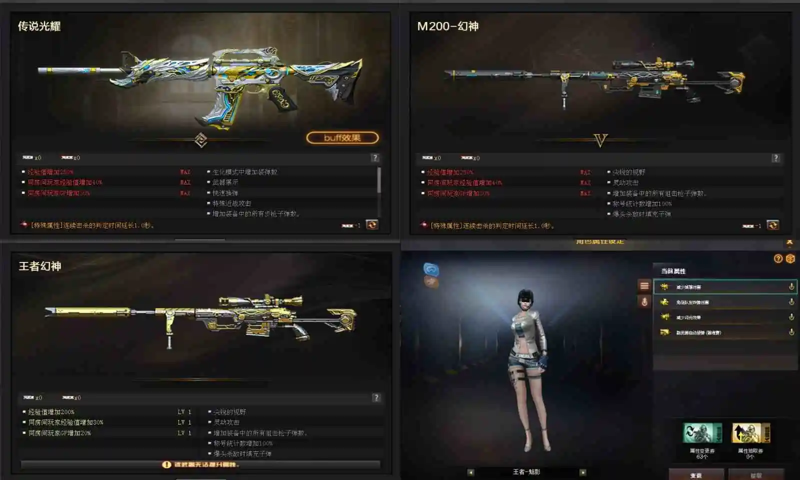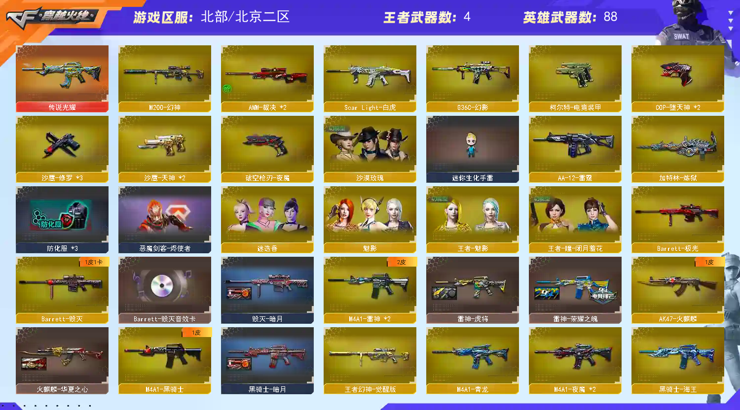 【英雄武器】_M200-幻神/王者幻神-觉醒版/Barrett-毁灭/Barrett-极光/Barrett-朱雀/Barrett-电竞装甲/AWM-天龙(2)/AWM-裁决/M4A1-青龙/M4A1-雷神(2)/M4A1-龙血/M4A1-黑骑士/黑骑士-海王/M4A1-夜魔(2)/HK417-朱雀/_Scar Light-白虎/AK47-火麒麟/AK47-黑鲨/AK-47-猩红传说(8)/AK47-B-战士/AK47-B-战神/王者之心-觉醒版/9A91-烈火/AA-12-雷霆/加特林-炼狱/COP-堕天神(2)/沙鹰-天神(2)/沙鹰-修罗(3)/破空枪刃-夜魔/柯尔特-电竞装甲/麒麟刺/龙啸/擎天(3)/屠龙/雷霆之锋/尼泊尔-电竞装甲/马来剑-夜魔/高爆手雷-雷霆/高爆手雷-夜魔(3)/烟雾弹-雷霆/烟雾弹-夜魔(3)/烟雾弹-电竞装甲(7)/恶棍-电竞装甲(7)/闪光弹-雷霆/闪光弹-夜魔(3)/闪光弹-电竞装甲(7)